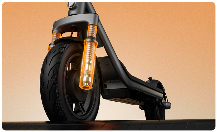 Equipado con suspensión delantera de doble resorte de alto rendimiento con 25mm de recorrido, absorbe eficazmente los impactos al contacto, reduciendo los baches para un viaje cómodo y suave.