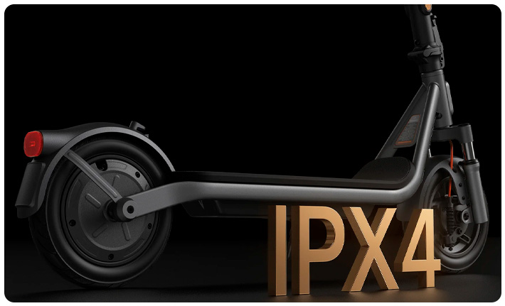 Cuenta con certificación de resistencia al agua IPX4 en toda la estructura del scooter y protección IPX6 en la batería, ofreciendo mayor seguridad frente a salpicaduras y condiciones climáticas adversas.