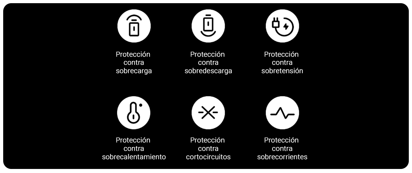 - · Protección contra sobrecarga, sobredescarga, sobretensión, sobrecalentamiento, cortocircuitos y sobrecorriente