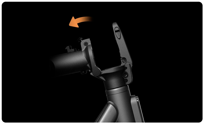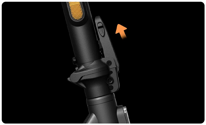 Asegurarse de que el scooter esté apagado y no se esté cargando antes de plegarlo. Sujetar el vástago, levantar el bloqueo de la palanca de liberación rápida y tirar de la palanca de liberación hacia afuera.