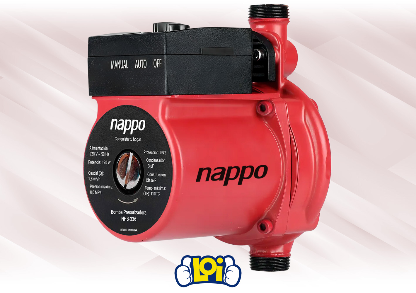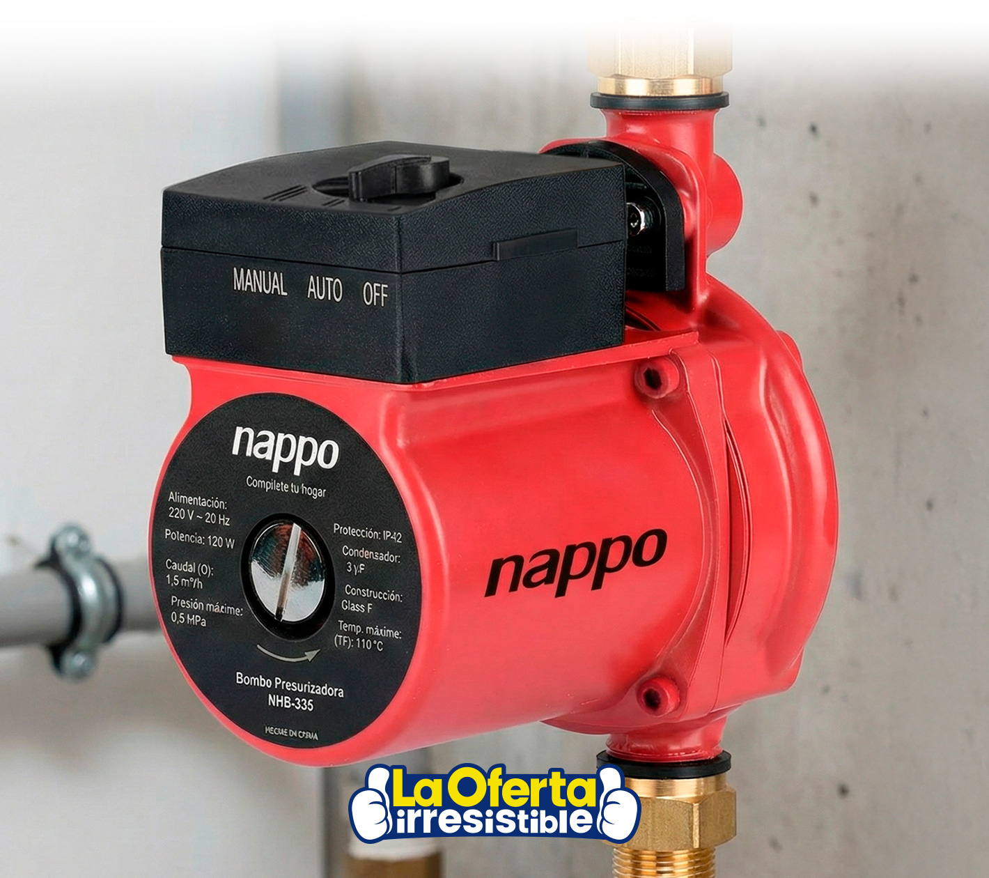 La bomba presurizadora NAPPO de 120W es una solución práctica y eficiente para mejorar la presión de agua en el hogar, ideal para duchas, calefones y griferías. Ofrece un caudal máximo de 1,8m³/h, altura de hasta 9 metros y presión máxima de 0,6MPa, con conexiones de 1/2" x 1/2" que facilitan su instalación. Cuenta con dos modos de funcionamiento (Auto y Manual) e interruptor automático para mayor comodidad, además de motor de aluminio con construcción Clase F y protección IP42 que garantizan durabilidad y seguridad.Podés canjear este artículo usando tus Metros OCA