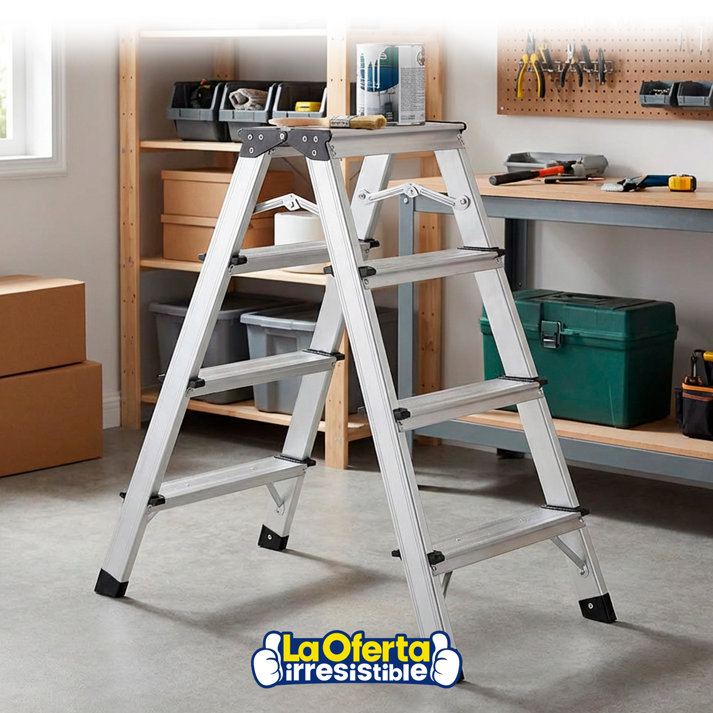• La escalera de aluminio de 4 escalones con patas antideslizantes es una opción práctica y segura para tareas del hogar o uso profesional, permitiéndote alcanzar alturas con comodidad y estabilidad. Su diseño tipo tijera plegable facilita el almacenamiento y transporte, ocupando poco espacio cuando no está en uso, mientras que su estructura liviana de aluminio asegura resistencia y durabilidad, soportando hasta 120kg. Incorpora escalones y patas antideslizantes que brindan mayor firmeza y evitan deslizamientos o daños en las superficies, siendo apta tanto para interiores como exteriores y ofreciendo un uso confiable en todo momento.