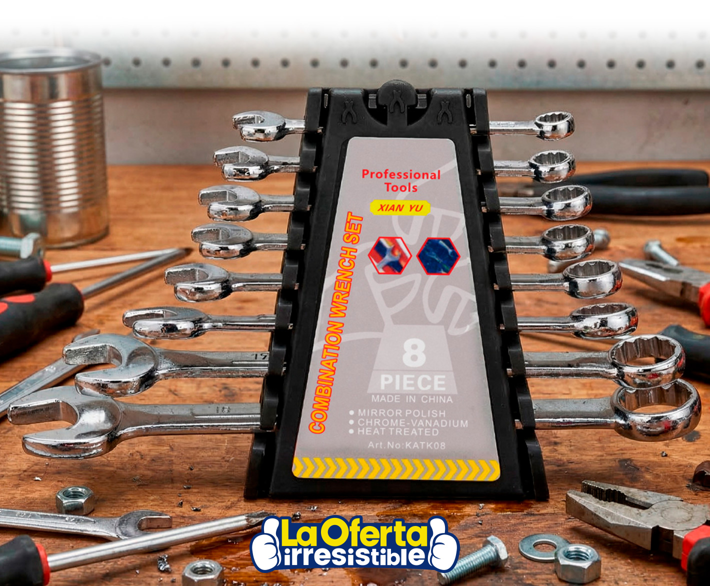 El Juego de Llaves Combinadas de 8 piezas con organizador es una herramienta práctica y confiable para realizar trabajos de ajuste, mantenimiento y armado en el hogar, el taller o en tareas mecánicas. Cada llave cuenta con doble sistema combinado, lo que permite trabajar con mayor precisión y adaptarse a diferentes tipos de tornillos y tuercas. Están fabricadas en acero de cromo vanadio, un material resistente que garantiza durabilidad, mayor resistencia al desgaste y un excelente rendimiento. El set incluye un organizador práctico, que facilita el almacenamiento, el transporte y mantiene todas las herramientas ordenadas y siempre al alcance de la mano.Podés canjear este artículo usando tus Metros OCA
