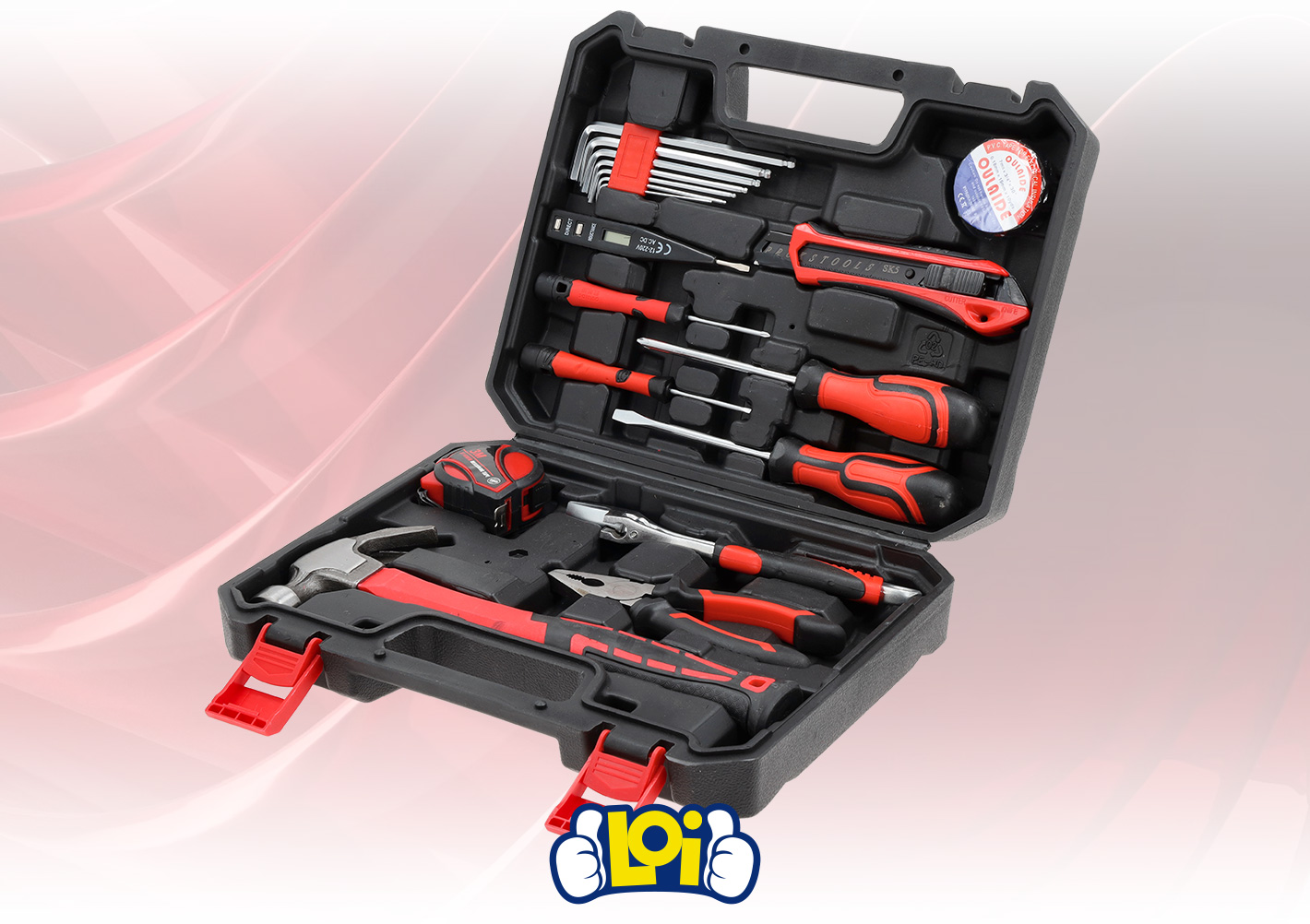 Este kit de herramientas es una solución completa y práctica para reparaciones del hogar y tareas de bricolaje. Fabricado en acero cromo vanadio, ofrece gran resistencia, durabilidad y protección contra la corrosión, mientras que sus asas de goma antideslizante brindan mayor comodidad y seguridad en el uso. Incluye herramientas esenciales como martillo de uña, llave inglesa, alicate universal, destornilladores (planos y Phillips), trincheta, detector de voltaje, llaves Allen con soporte, cinta métrica de 3m y cinta aisladora. Además, incorpora un maletín resistente que mantiene todo organizado y facilita su transporte y almacenamiento, siendo ideal tanto para uso doméstico como profesional.Disponible en: