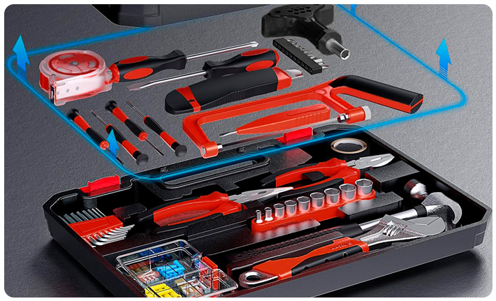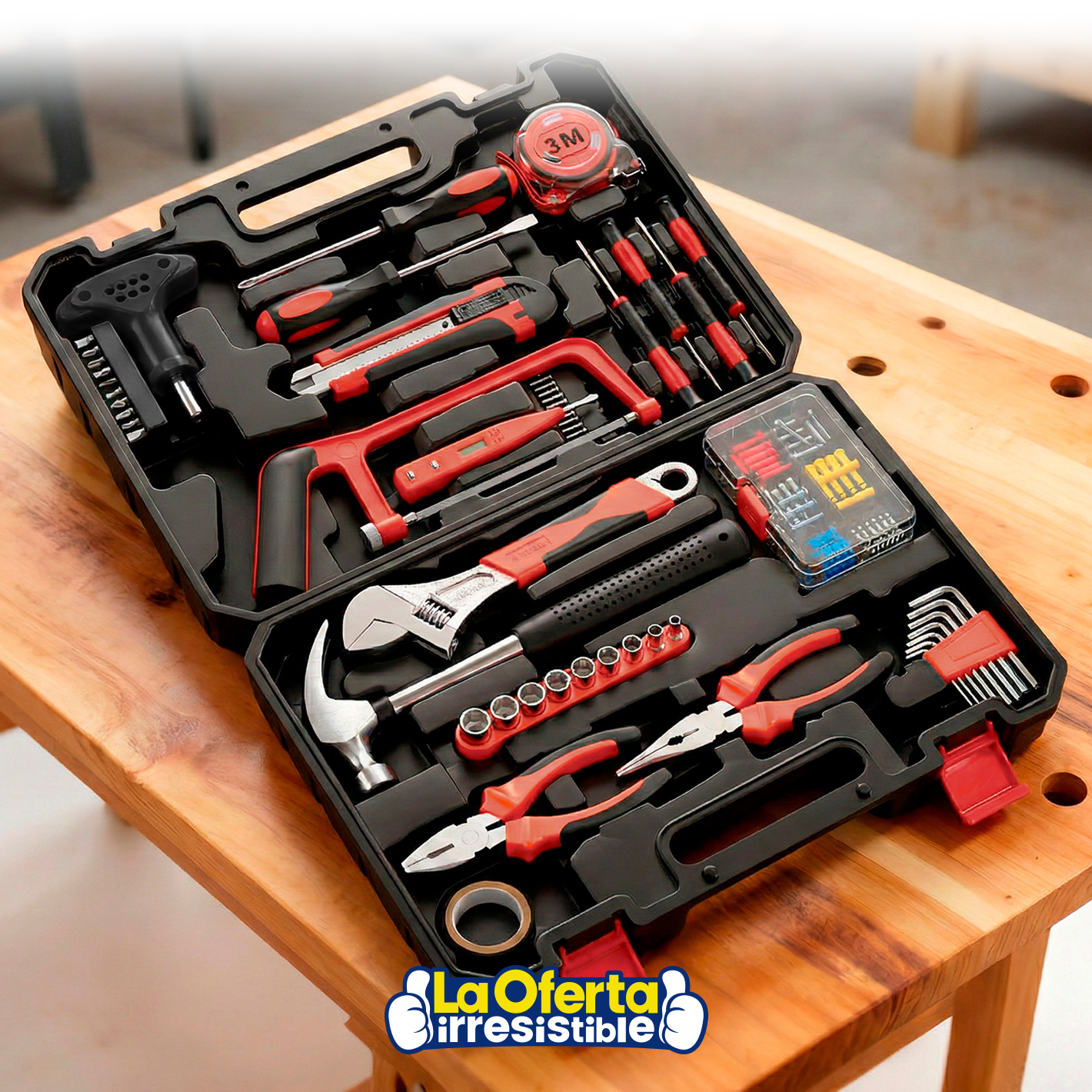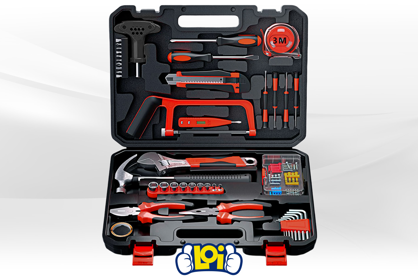 El Kit de Herramientas de 82 piezas con maletín de transporte está fabricado en acero cromo vanadio, lo que garantiza resistencia, durabilidad y protección contra la corrosión. Diseñado para cubrir una amplia variedad de trabajos, incluye las herramientas esenciales para reparaciones menores, montaje de muebles, mantenimiento y tareas básicas de bricolaje, siendo ideal tanto para uso doméstico como profesional. Sus asas de goma antideslizante brindan un agarre seguro y cómodo, mientras que el maletín resistente permite mantener todas las piezas organizadas, protegidas y listas para transportar y almacenar fácilmente después de cada uso.Disponible en: