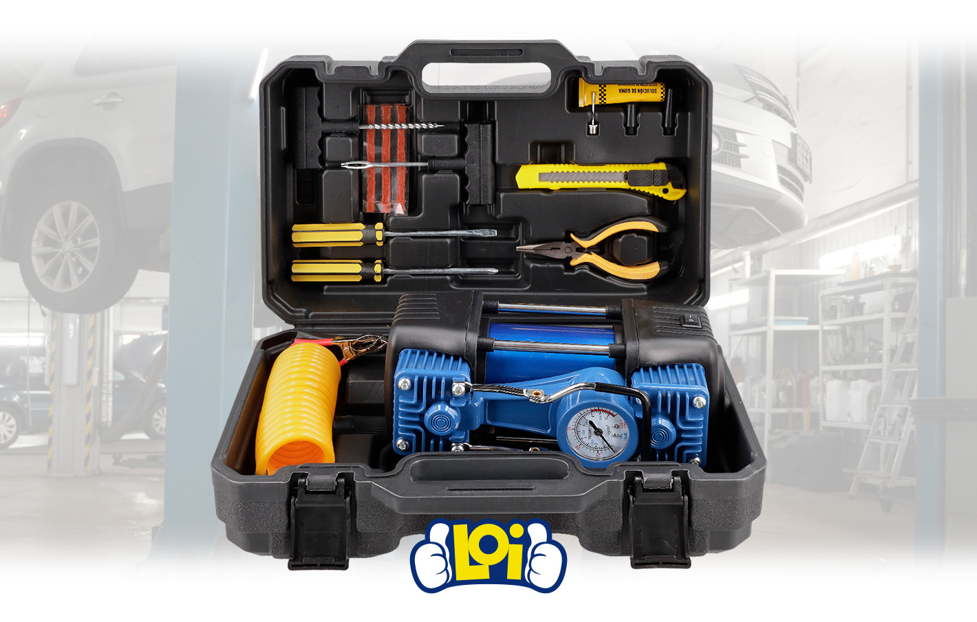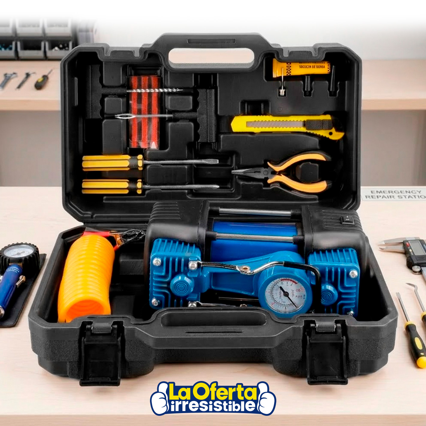 Este completo set de herramientas es una solución práctica para emergencias y trabajos de mantenimiento. Incluye un compresor de aire de 12V con presión máxima de 150PSI, ideal para inflar neumáticos de autos, bicicletas y otros inflables de forma rápida y sencilla. Su potente motor y buen volumen de inflado permiten trabajar con mayor eficiencia cuando más lo necesitas. El kit incorpora además una variedad de herramientas útiles para reparaciones básicas, junto con boquillas de aire multiuso y accesorios para distintas tareas. Todo se guarda en un práctico maletín de transporte, que mantiene cada pieza organizada y facilita llevar el set cómodamente en el auto o tenerlo siempre listo para usar.Podés canjear este artículo usando tus Metros OCA