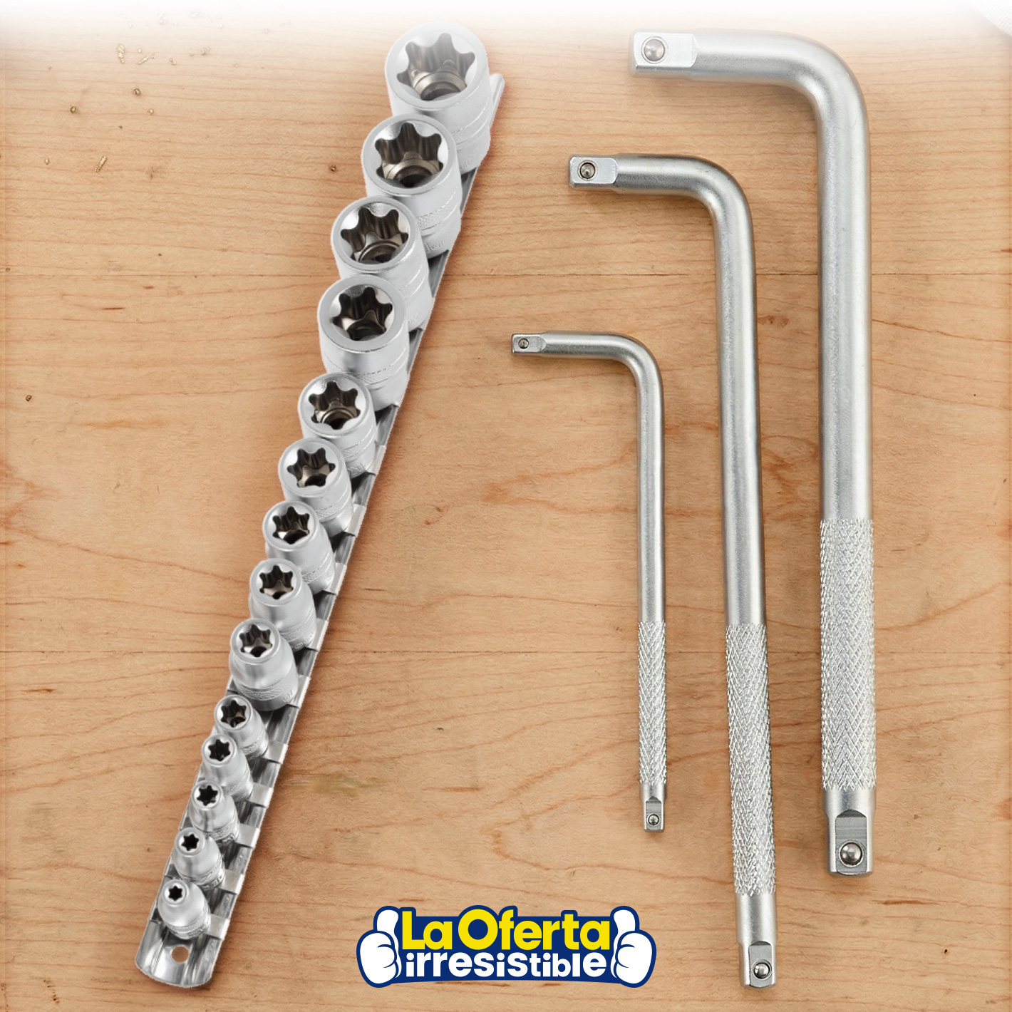 El set de llaves de 17 piezas es una opción práctica y versátil para todo tipo de trabajos, fabricado en resistente cromo vanadio que garantiza durabilidad y excelente desempeño. Incluye 14 dados Torx de distintos tamaños junto a tres llaves tubo tipo “L” (1/2", 3/8" y 1/4"), ofreciendo mayor alcance y comodidad en cada uso. Su diseño facilita el manejo y lo hace ideal tanto para tareas del hogar como para uso en taller o trabajos mecánicos, brindando una solución completa y confiable en cualquier situación.