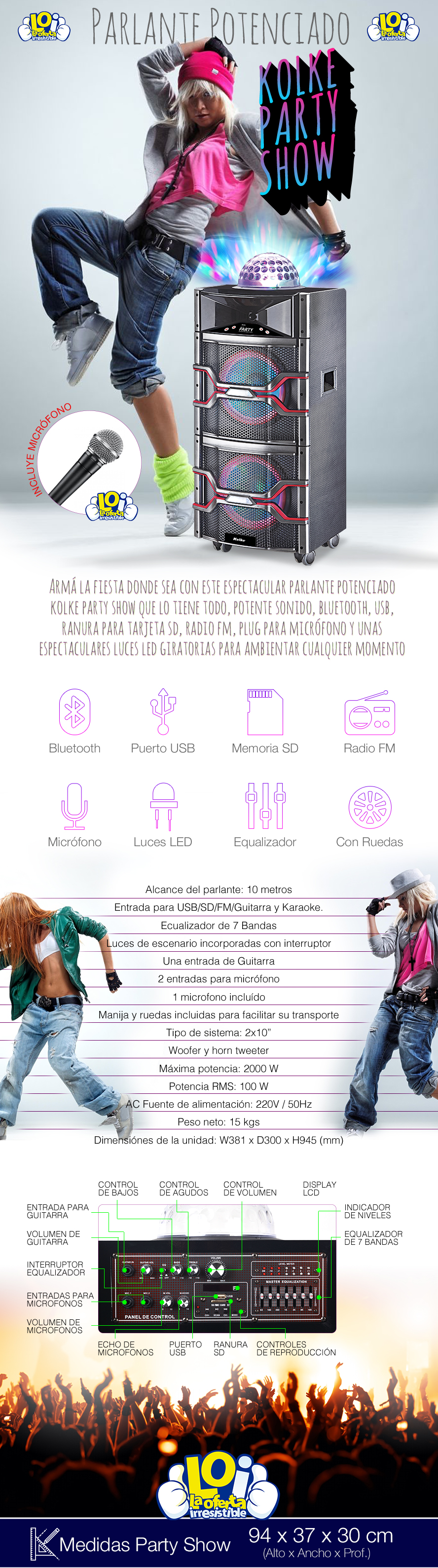 Parlante Potenciado Kolke Party BT FM SD USB Luces LED