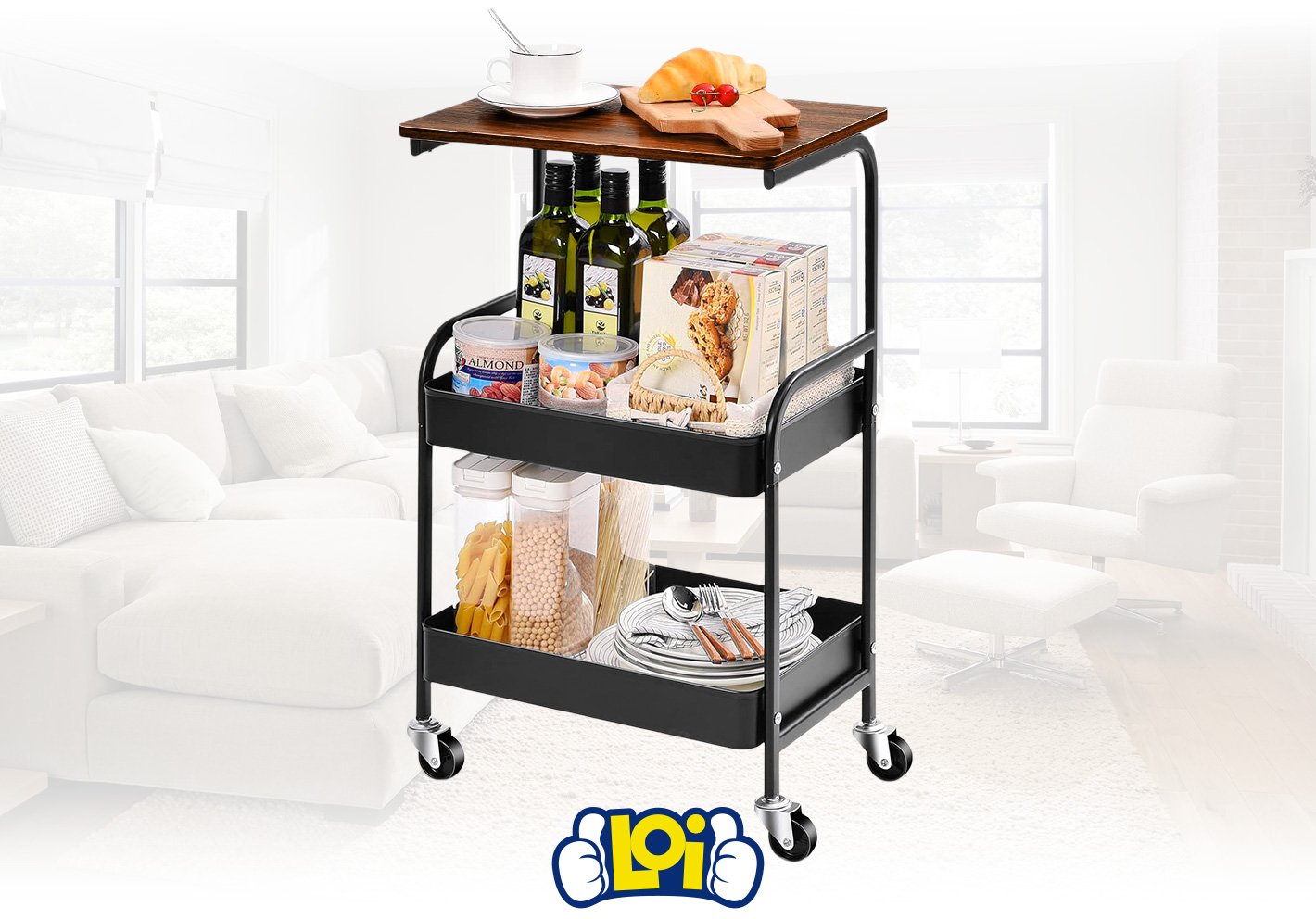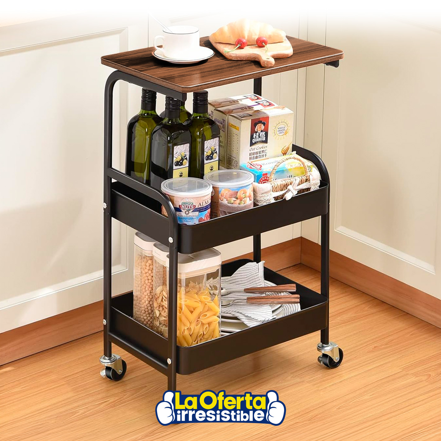 Este carrito organizador con mesa y 2 estantes es una solución práctica y versátil para optimizar cualquier espacio. Incorpora una superficie de MDF que funciona como mesa auxiliar, ideal para colocar una notebook, impresora u otros objetos de uso diario, adaptándose perfectamente a hogares, oficinas o dormitorios. Su diseño de dos niveles con bandeja superior elevada permite almacenar desde documentos y revistas hasta botellas o alimentos, brindando un excelente aprovechamiento del espacio. Fabricado con una estructura de acero resistente y superficie de MDF, garantiza durabilidad y estabilidad en el uso diario, con materiales resistentes a rayaduras y al óxido. Además, sus 4 ruedas giratorias facilitan el desplazamiento en cualquier dirección, mientras que las 2 ruedas con freno aseguran firmeza cuando lo necesitás. Compacto, funcional y fácil de integrar, es ideal para mantener todo organizado y al alcance.Podés canjear este artículo usando tus Metros OCA