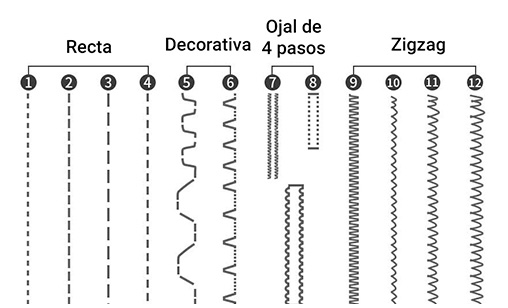 - · 12 puntadas (recta, zigzag, ojal de 4 pasos, decorativas)