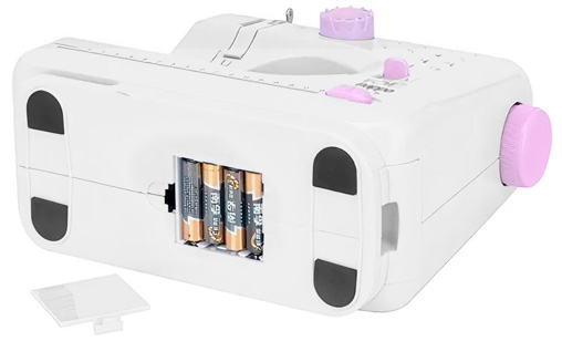 - Se puede conectar a la corriente o funcionar con 4 pilas AA, lo que brinda una gran versatilidad para que puedas usarla dondequiera que vayas. No se deben utilizar la batería y el adaptador de corriente al mismo tiempo, ya que esto podría afectar su funcionamiento y provocar atascos o rotura de agujas.