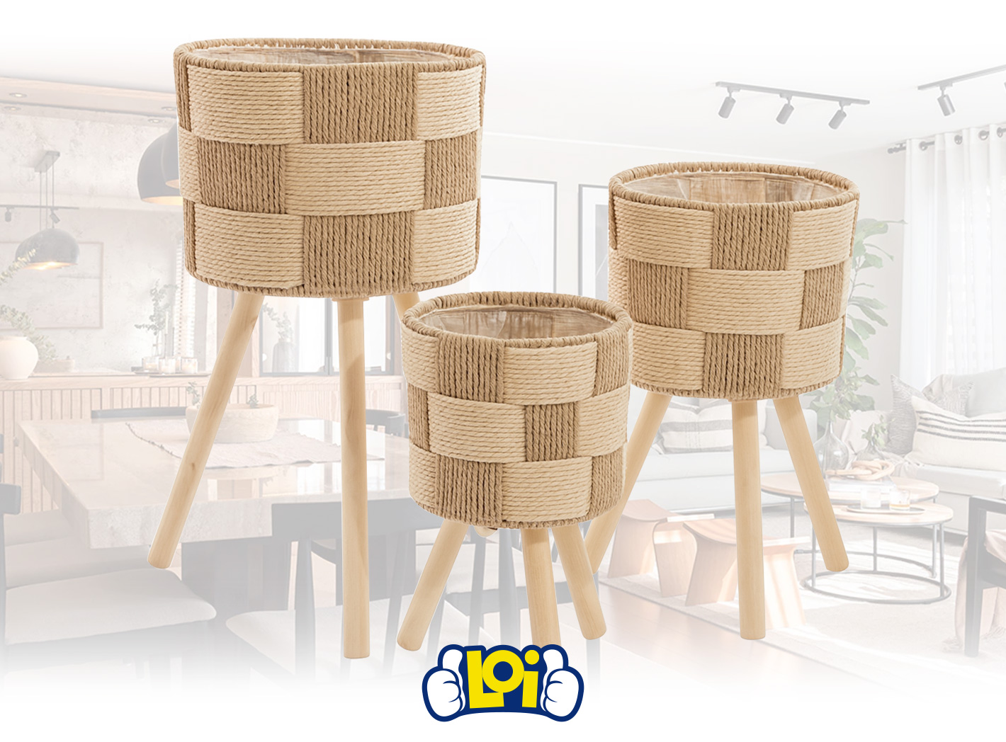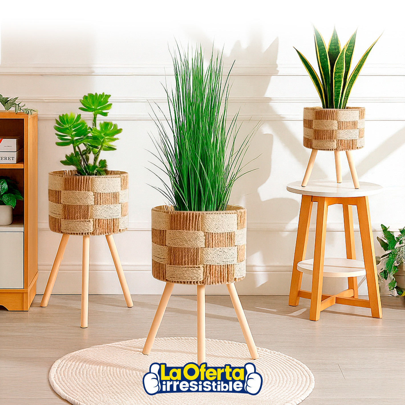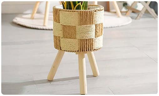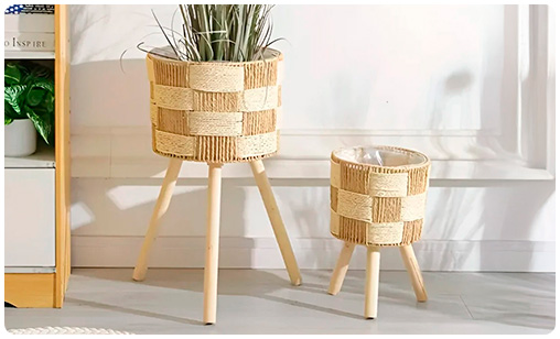 Set de 3 Porta Macetas de Fibra Trenzada y Patas de Madera, de 57 x 29cm, 43 x 25cm y 34 x 20cm