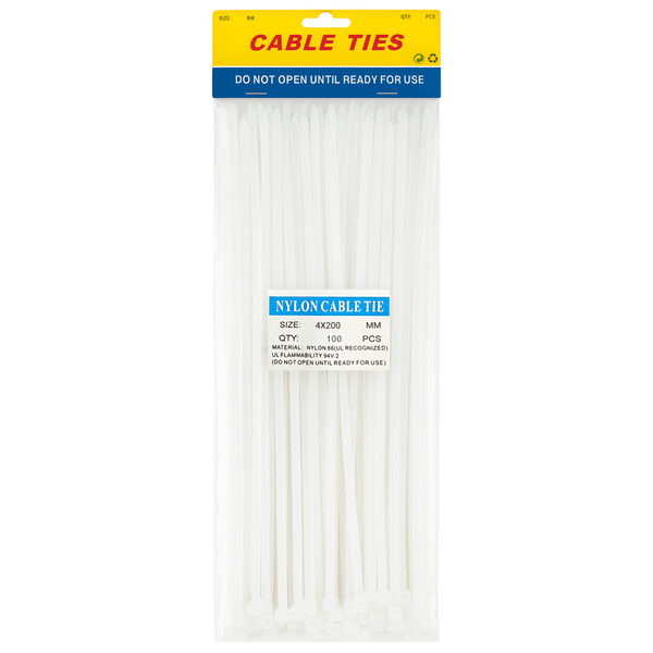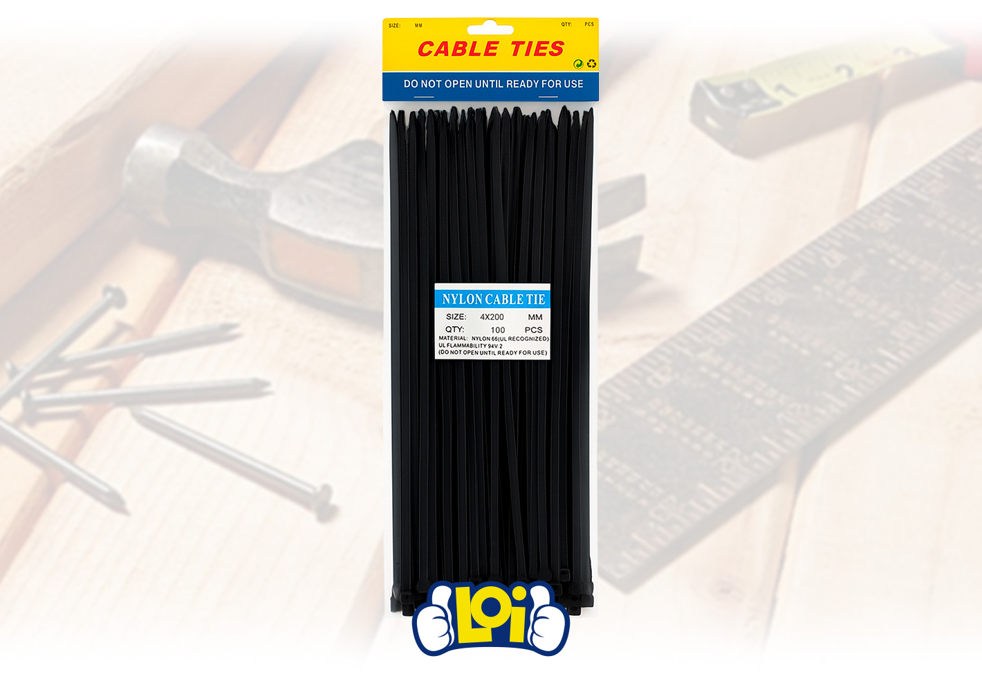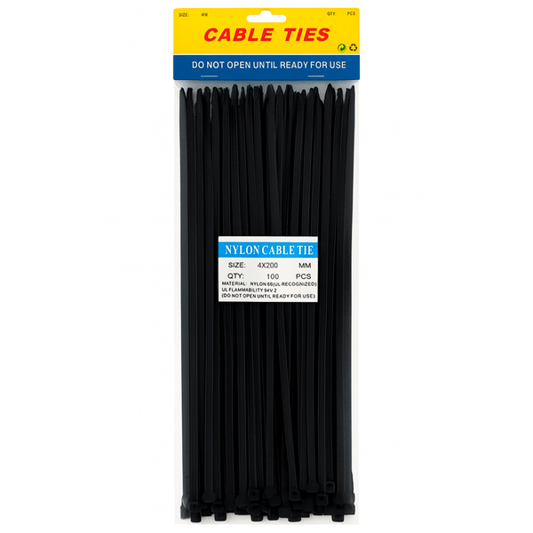 Kit de 100 Precintos de 4 x 200mm, Nylon 66, Resistencia a Altas Temperaturas y Rayos UV - Negro