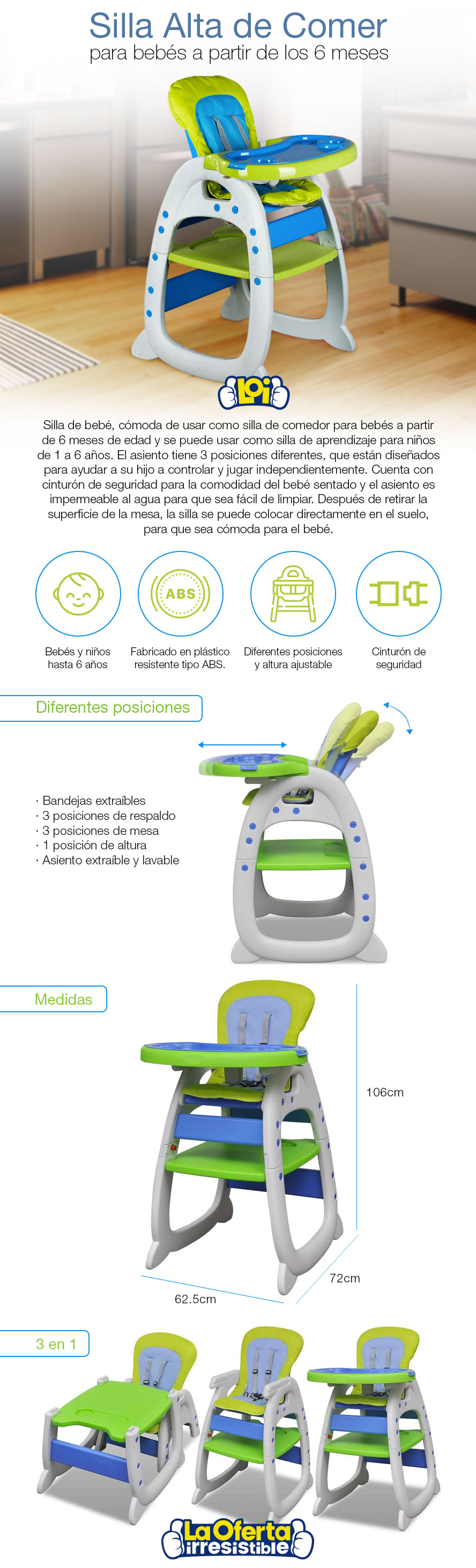 Silla de Comer para Bebé 3 en 1 Desmontable Posiciones Calidad Premium