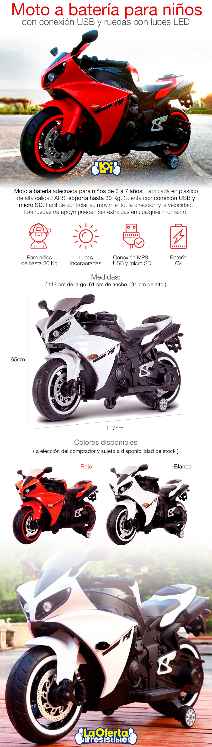 Moto Grande Alta Gama a Batería para Niños hasta 30Kg con Música y Luces - Blanca