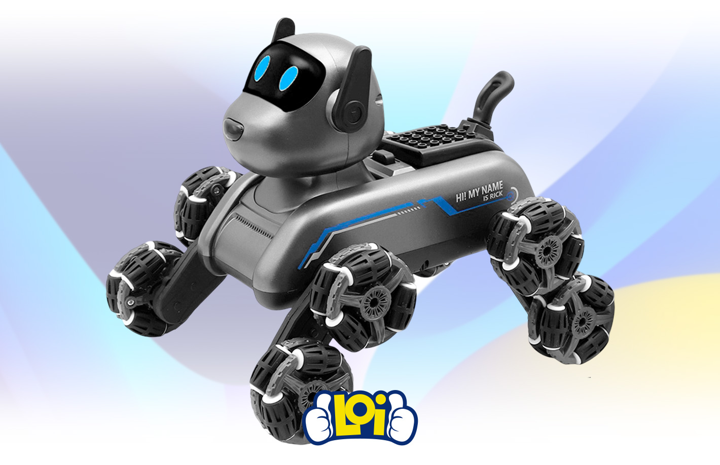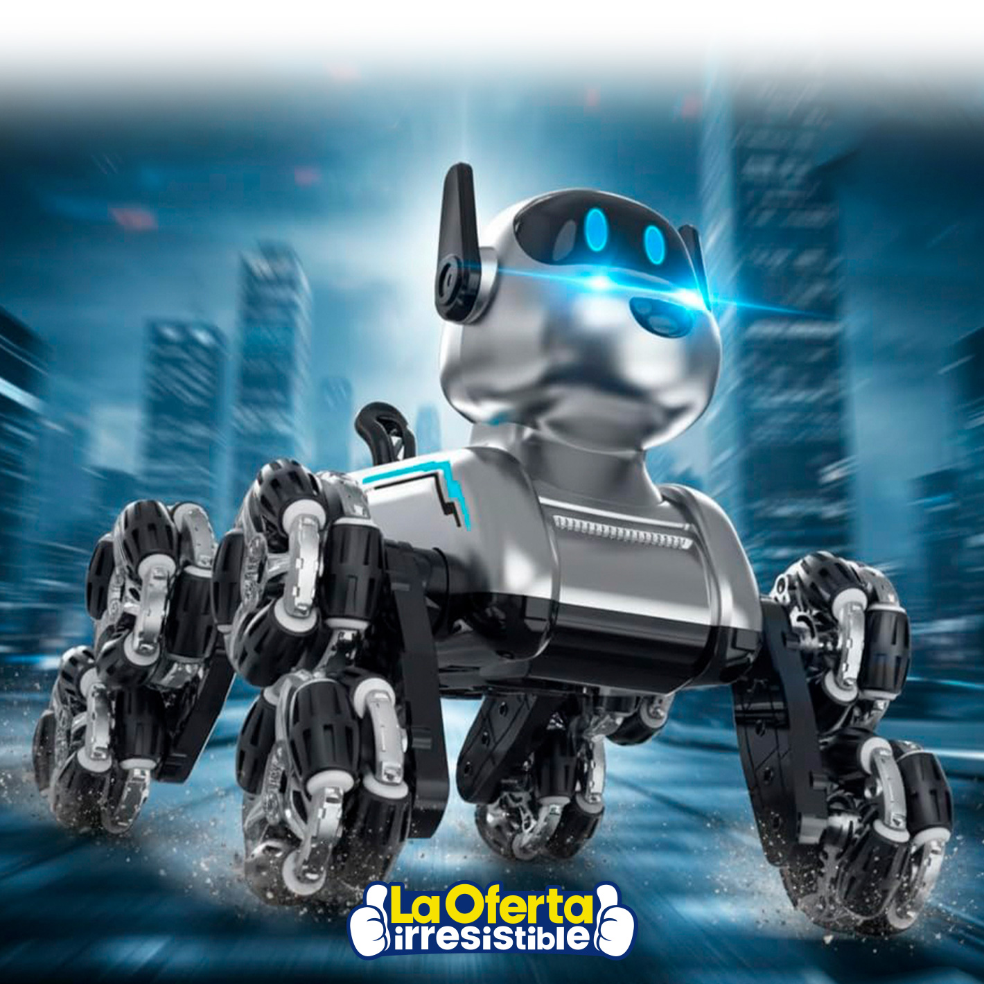 La diversión será eterna con tu amigo más fiel, ahora hecho un robot inteligente. Perfectamente manejable con control remoto, su estructura resistente y sus múltiples movimientos lo convierten en un compañero ideal de juego interactivo. Cuenta con luces LED cambiantes en los ojos, sonidos perrunos y 3 canciones diferentes que harán de cada momento único e irrepetible. Además, puede girar hasta 360º, elevar sus ruedas y realizar demostraciones automáticas con sólo un clic, ofreciendo una experiencia completa de juego para los más pequeños.