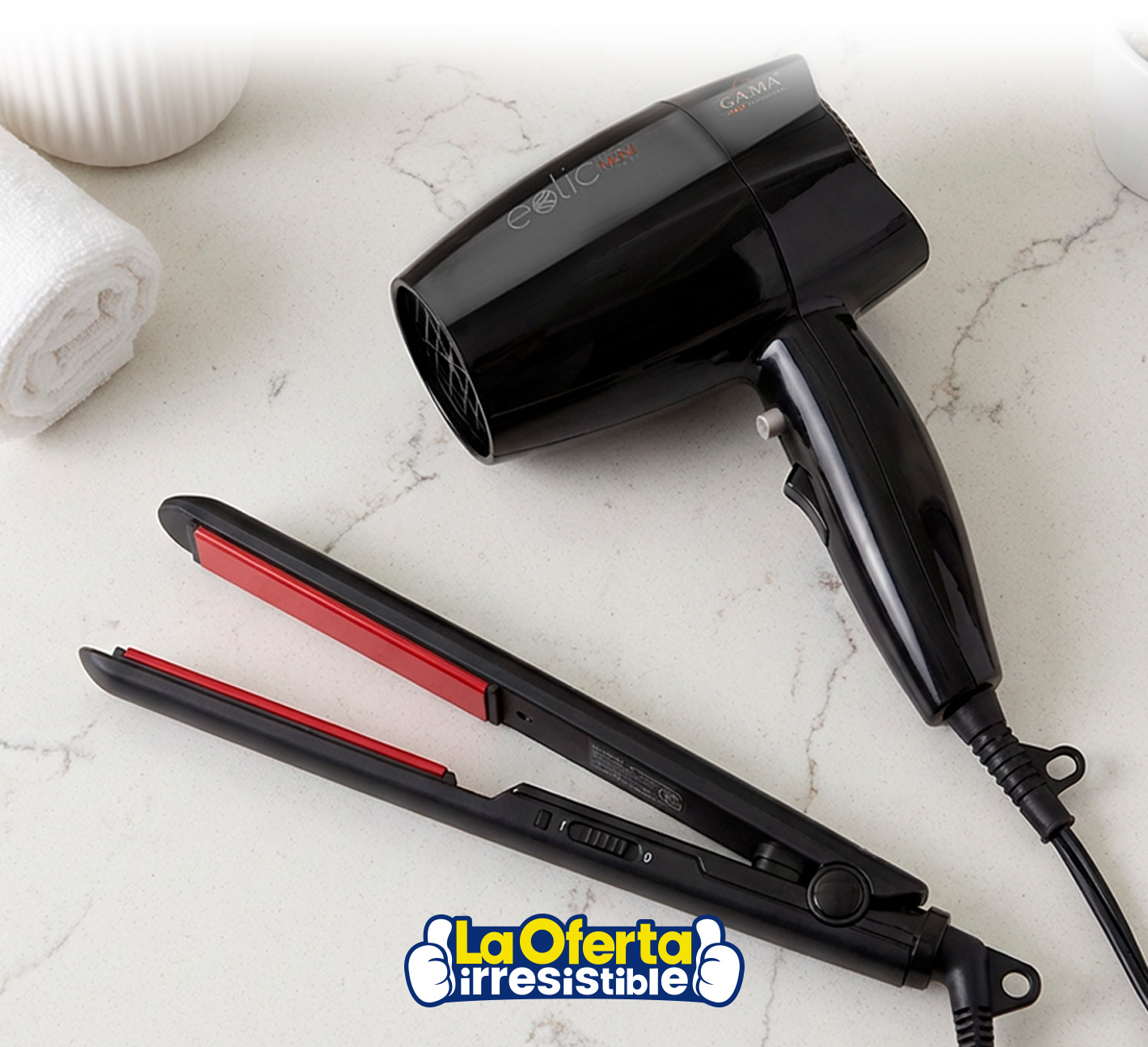 Combo GAMA Plancha de Pelo Bella Delicate Tourmaline ION hasta 230°C + Secador de Pelo Eolic Mini Ceramic 1600W de Potencia