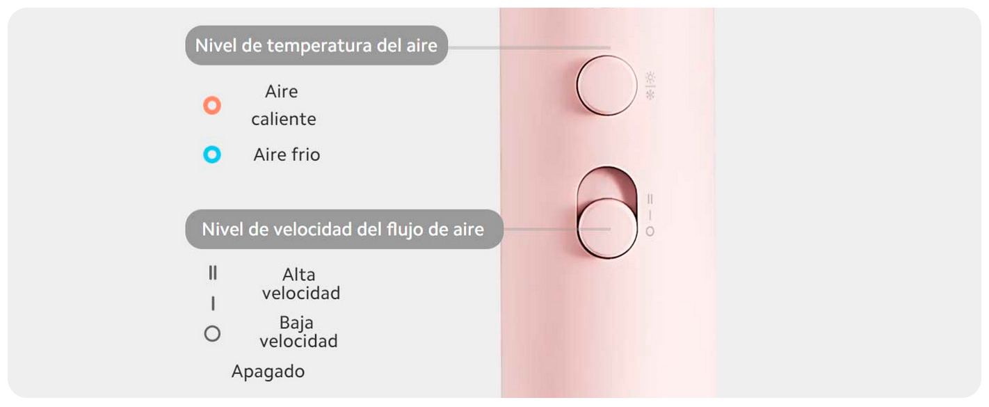 - Los dos modos de temperatura del aire se combinan con dos velocidades de flujo para satisfacer las diferentes necesidades de secado. Solo tenés que pulsar para alternar entre aire caliente y frío.