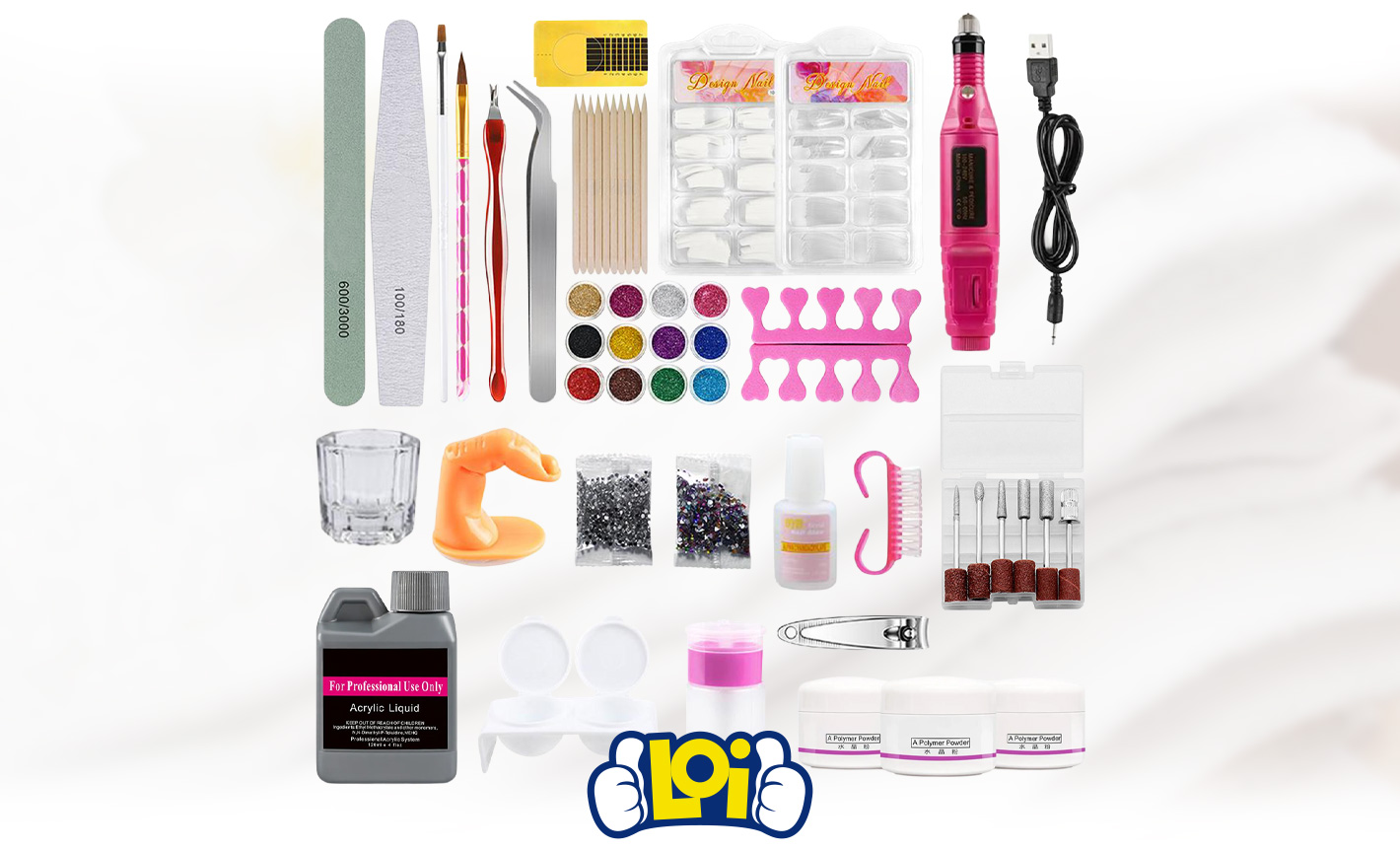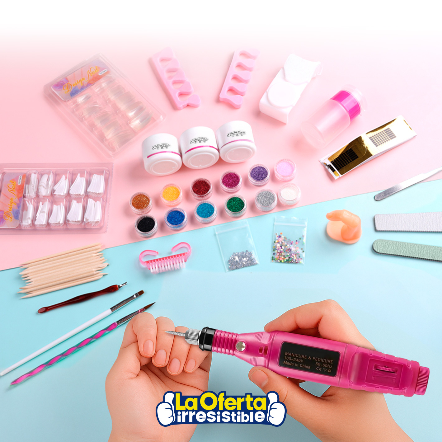 Kit Completo de Manicura 26 Piezas con Torno, Accesorios, Glitter, Piedras, Polvo Acrílico y Más