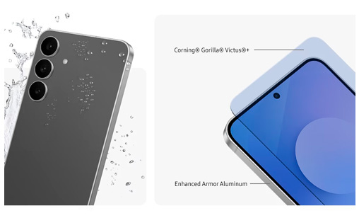 - Con Corning Gorilla Glass Victus+ y un marco de Armor Aluminum reforzado, el Galaxy S25 FE está fabricado con materiales prémium y resistentes. También cuenta con certificación IP68 para resistencia al polvo y al agua, para que encares tu próxima aventura con confianza.