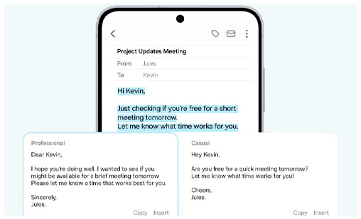 - Escribí mejor y más rápido con Writing Assist. Te ayuda a pulir la gramática, reformular oraciones y ajustar el tono adecuado, ya sea que estés enviando un mensaje, un correo electrónico o tomando notas. Simplemente escribí tus ideas y dejá que la AI alcance un mejor estilo y claridad con tus palabras.