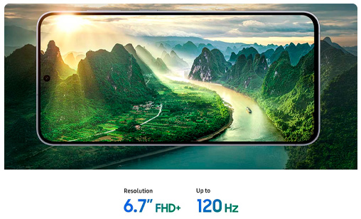 - La pantalla inmersiva de 6,7" FHD+ del Galaxy S25 FE ofrece una experiencia de visualización envolvente con una frecuencia de actualización de hasta 120Hz. Con biseles reducidos al mínimo y una pantalla más brillante con Vision Booster, brinda imágenes nítidas y vibrantes que mantienen tu contenido siempre definido.