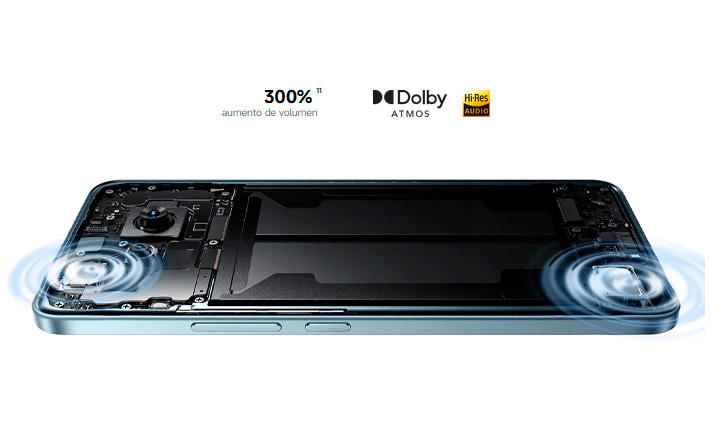 Equipado con dos altavoces, ofrece hasta un 300% de volumen para una experiencia auditiva envolvente.