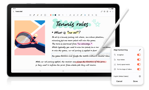 - La ayuda de escritura a mano te permite ordenar rápidamente notas manuscritas desordenadas para que tu trabajo luzca refinado. Podés enderezar líneas desiguales, hacer que el espaciado sea uniforme, alinear letras y corregir formas de letras en un instante. Anotá ideas, tomá notas de estudio o dibujá libremente con el S Pen; tu escritura se sentirá natural y sin esfuerzo.