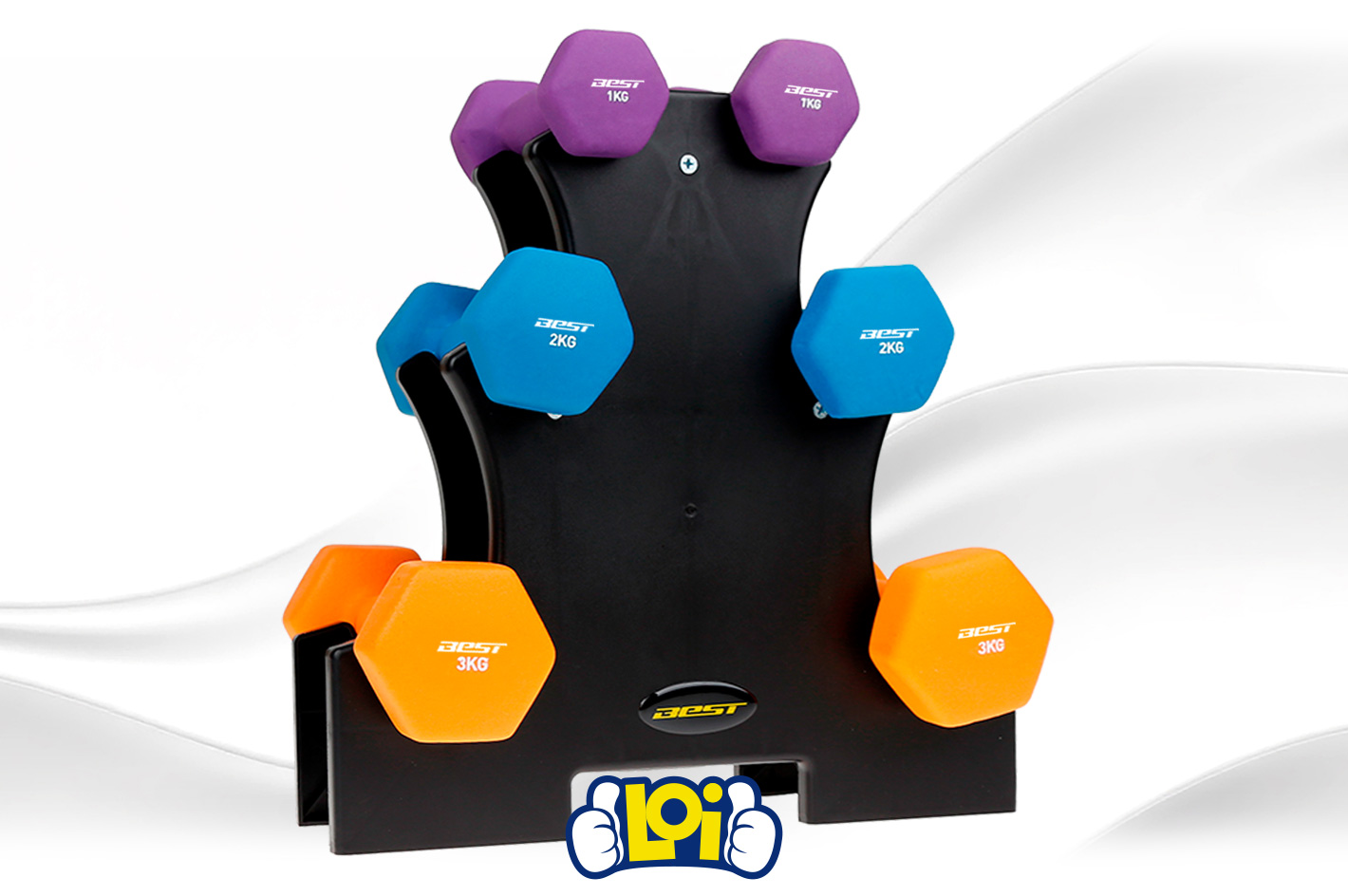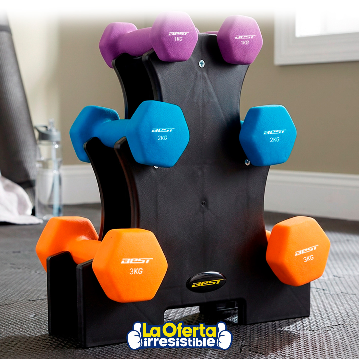 El set de mancuernas Best es ideal para entrenar en casa de forma práctica y ordenada. Incluye tres pares de mancuernas que permiten ajustar la intensidad según cada ejercicio, cubriendo rutinas de fuerza, tonificación y acondicionamiento general. Su superficie recubierta ofrece un agarre cómodo y seguro, cuidando las manos y el piso durante el uso. Además, el stand plegable facilita el guardado y mantiene todo organizado, convirtiéndolo en una opción funcional y eficiente para el entrenamiento diario.Podés canjear este artículo usando tus Metros OCA