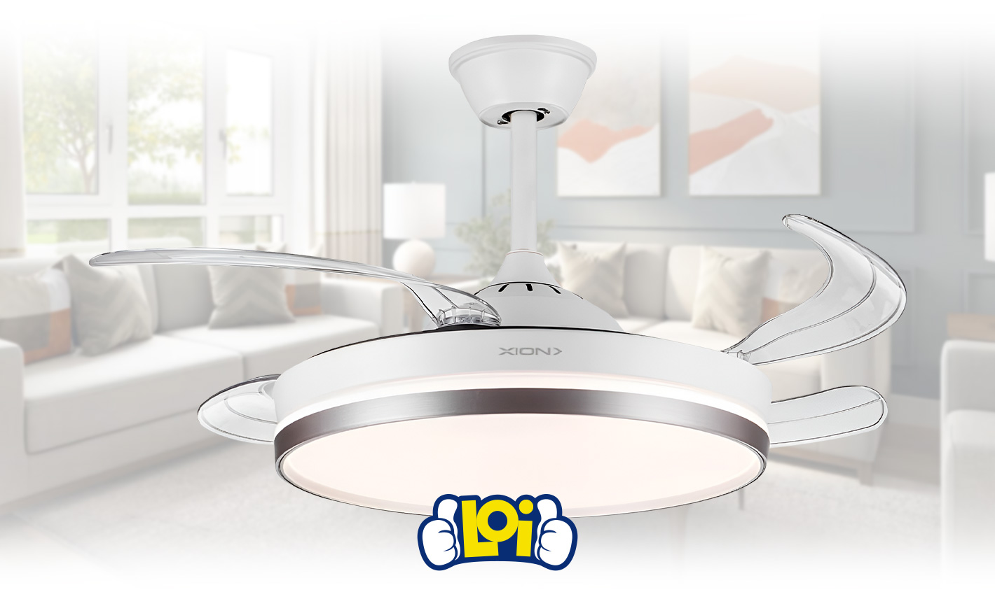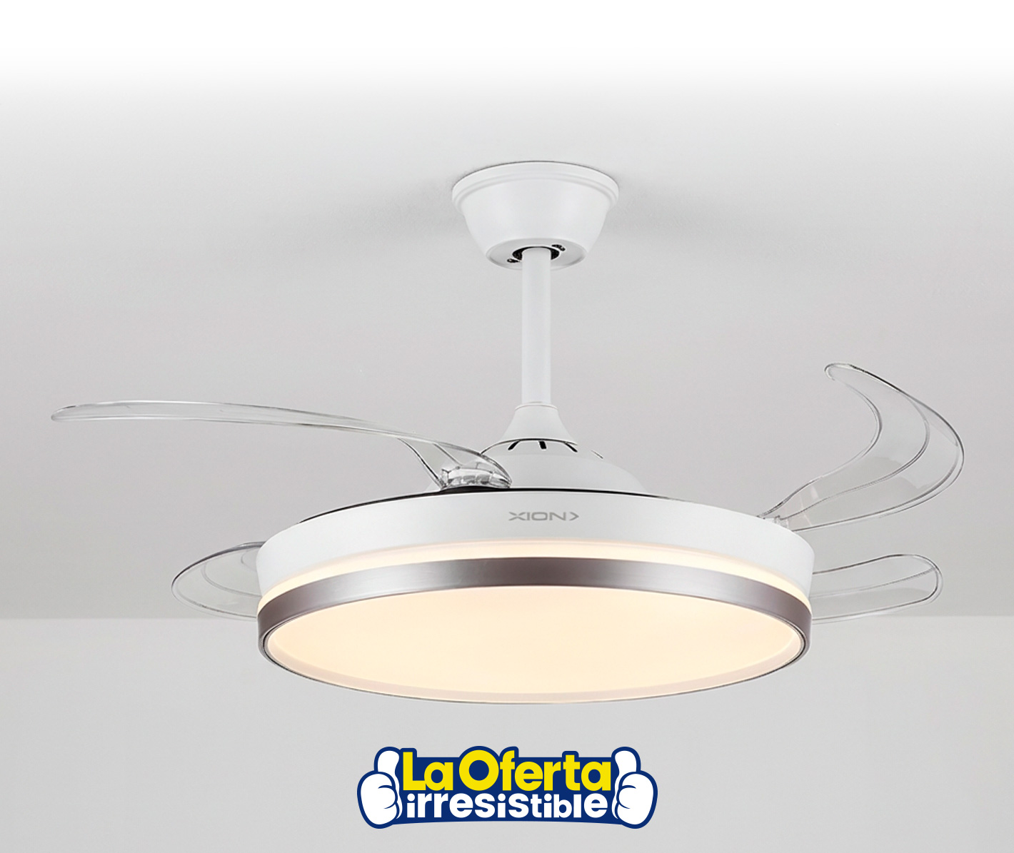 Este ventilador de techo Xion de 42" combina estilo y funcionalidad con 4 aspas retráctiles y transparentes que se despliegan al encenderse. Ofrece 6 velocidades, función reversible y un motor AC de 32W, silencioso y duradero. Su luz LED integrada permite elegir entre tres tonos: fría, cálida y neutra, adaptándose a cada ambiente. Además, incluye timer de 1, 3 y 6 horas y control remoto para un manejo cómodo y práctico.Disponible en: