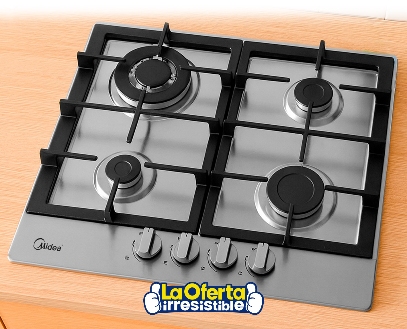 Este anafe a gas Midea ofrece un diseño moderno y funcional, fabricado en acero inoxidable con rejillas de hierro fundido para mayor durabilidad y estabilidad. Cuenta con cuatro hornallas, incluyendo una de triple corona, 2 semi rápidas y una de bajo rendimiento, lo que permite cocinar con diferentes niveles de potencia. Su encendido a una mano brinda mayor comodidad, y puede funcionar tanto con gas GLP (instalado) como con gas natural, gracias al kit de conversión incluido. Con un formato compacto y práctico, se adapta perfectamente a distintos tipos de cocina, ofreciendo una experiencia de cocción cómoda, segura y eficiente.Disponible en: