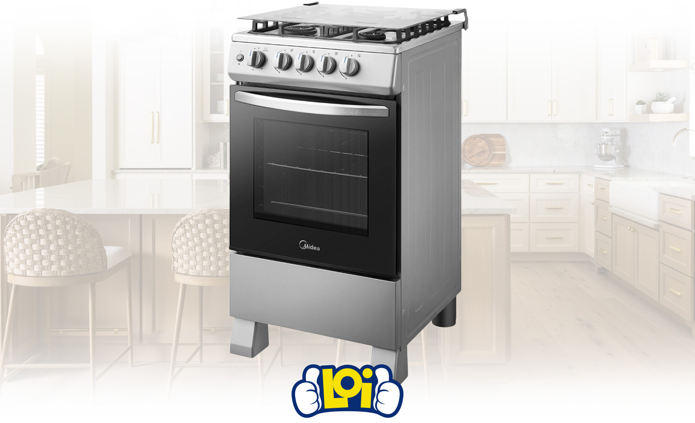 Cocina a Gas MIDEA 4 Hornallas FireVortex, Tapa de Vidrio, Horno de 62L con Bandeja y Rejilla