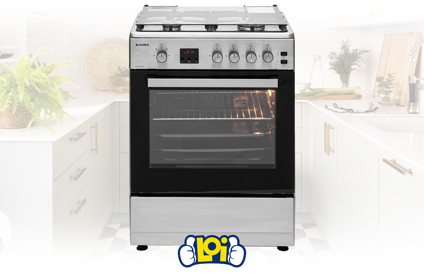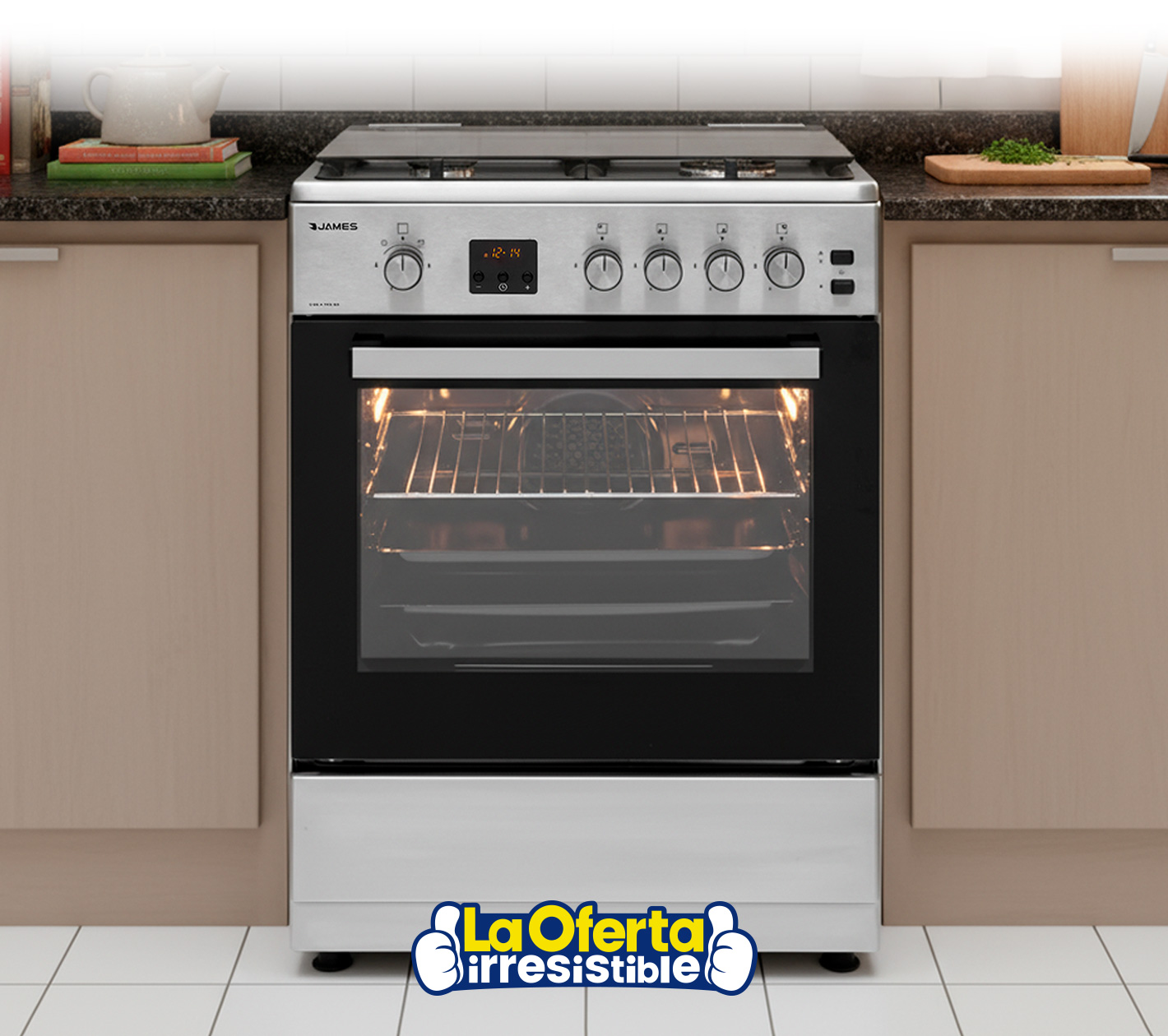 La cocina a gas James de 4 hornallas combina diseño moderno y funcionalidad, equipada con mesada de acero inoxidable, parrillas de hierro fundido y encendido electrónico total. Su horno enlozado incorpora convección, grill a gas, luz interior, puerta con doble vidrio y termocupla de seguridad, ofreciendo un uso cómodo y seguro ideal para quienes buscan eficiencia y excelentes resultados en cada preparación.Disponible en: