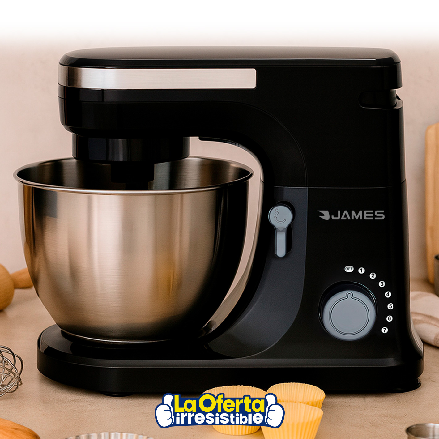La Batidora James combina potencia, capacidad y diseño para facilitar todas tus preparaciones. Con 800W y un bowl de acero inoxidable de 4,5L, permite amasar, batir y mezclar con total comodidad. Sus 7 velocidades y control electrónico aseguran resultados precisos, ideal para lograr masas perfectas y mezclas suaves en cada receta.Disponible en: