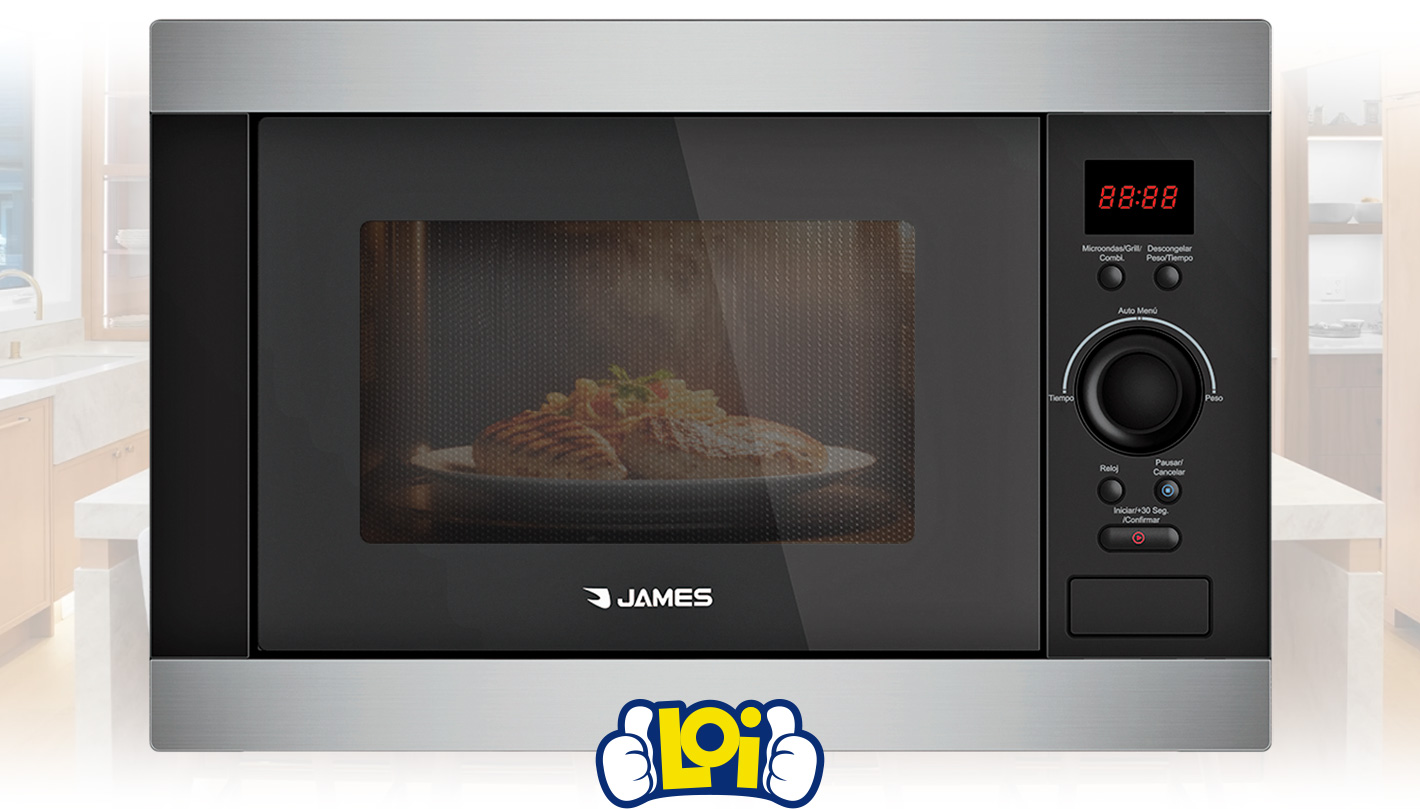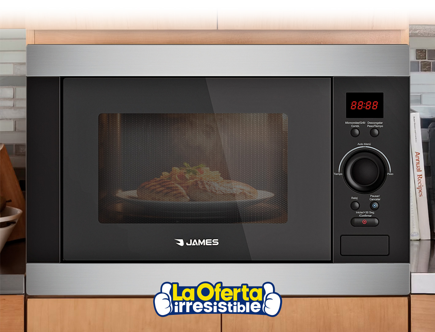 El Microondas Empotrable James de 28L combina diseño integrado y 900W de potencia para cocinar, calentar y descongelar con eficiencia. Cuenta con grill combinado, 5 niveles de potencia, 8 programas automáticos, timer y reloj. Su interior de acero inoxidable ofrece mayor durabilidad y fácil limpieza, mientras que el plato giratorio de 31,5cm garantiza una cocción uniforme. Con bloqueo para niños y un funcionamiento práctico e intuitivo, es la opción ideal para una cocina moderna, funcional y equipada.Disponible en: