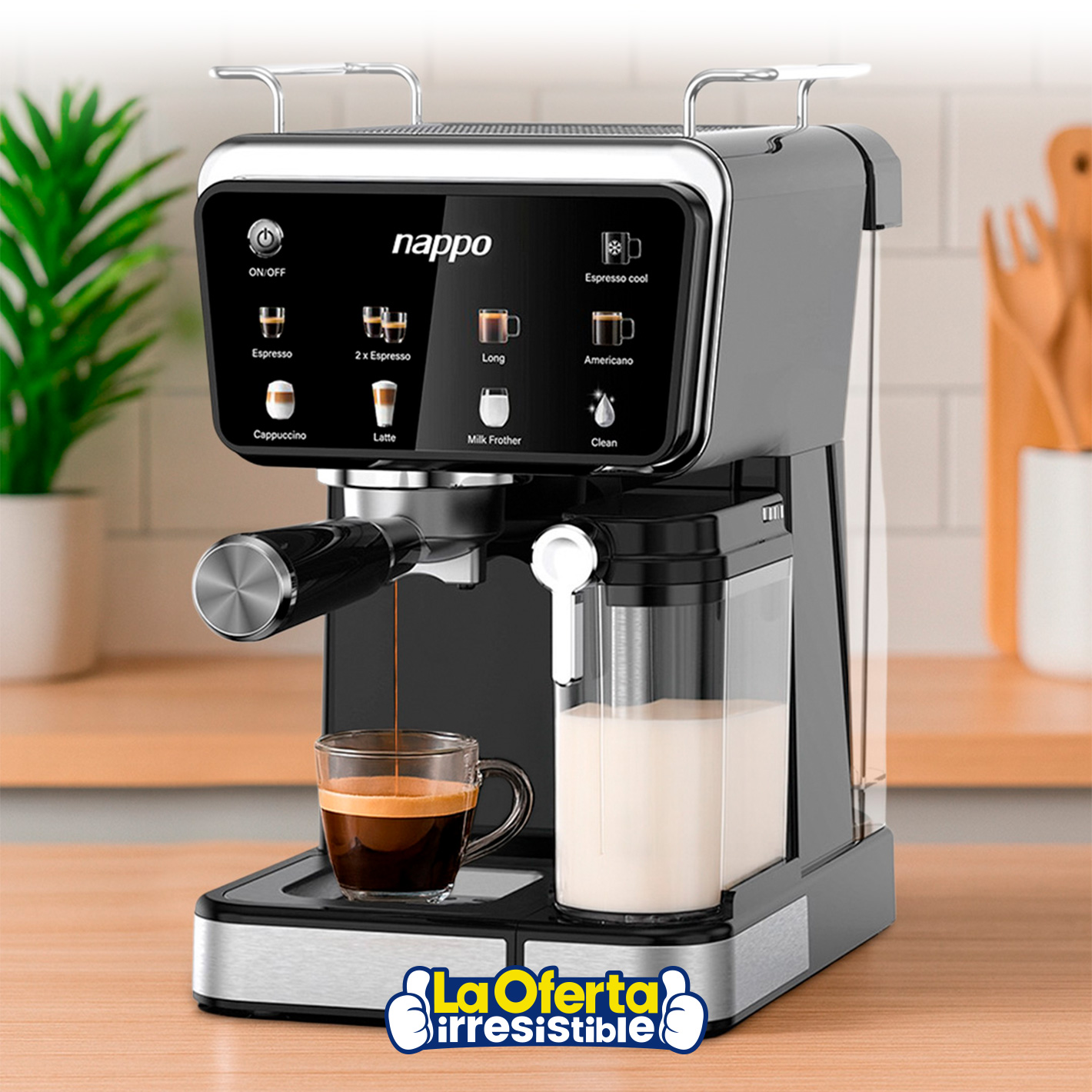 La Cafetera Espresso Barista Craft NAPPO combina versatilidad y diseño en un solo equipo. Con 1350W de potencia, una bomba italiana de alta presión de 20 bares y un sistema de calentamiento rápido Thermoblock, garantiza una extracción de café profesional en cada uso. Su depósito de agua extraíble de 1,5L y el depósito de leche de 0,5L permiten preparar una amplia variedad de bebidas: espresso, espresso doble, espresso frío, americano, capuccino o latte. Gracias a su compatibilidad con cápsulas Nespresso, su control táctil, su portafiltros de aleación de aluminio con filtros de acero inoxidable, y su capacidad para preparar dos tazas a la vez, se adapta a las necesidades de cualquier amante del café. Además, cuenta con control de temperatura NTC y PID, protección contra sobrecalentamiento y sobrepresión, y una bandeja de goteo extraíble para facilitar la limpieza.Podés canjear este artículo usando tus Metros OCA