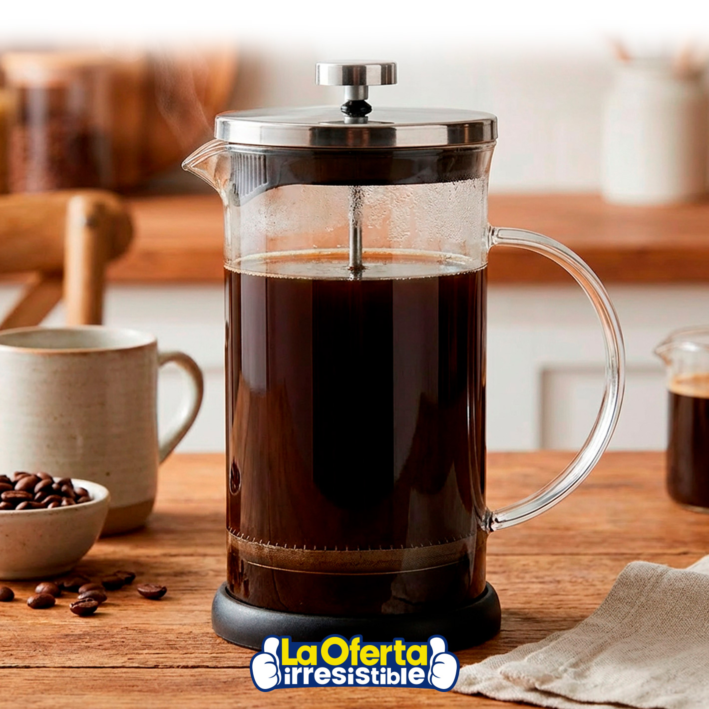 Disfrutá de un café con sabor intenso y aroma auténtico con esta prensa francesa de 600ml de capacidad. Su diseño combina vidrio de borosilicato resistente al calor y filtro de acero inoxidable, garantizando durabilidad y una excelente extracción del café. Su uso es simple y práctico: solo agregá café molido, agua caliente y dejá infusionar unos minutos para obtener una bebida llena de sabor. Además, su diseño compacto y fácil de desmontar permite transportarla y limpiarla con comodidad, siendo ideal para preparar café, té o infusiones en casa o donde quieras.Podés canjear este artículo usando tus Metros OCA