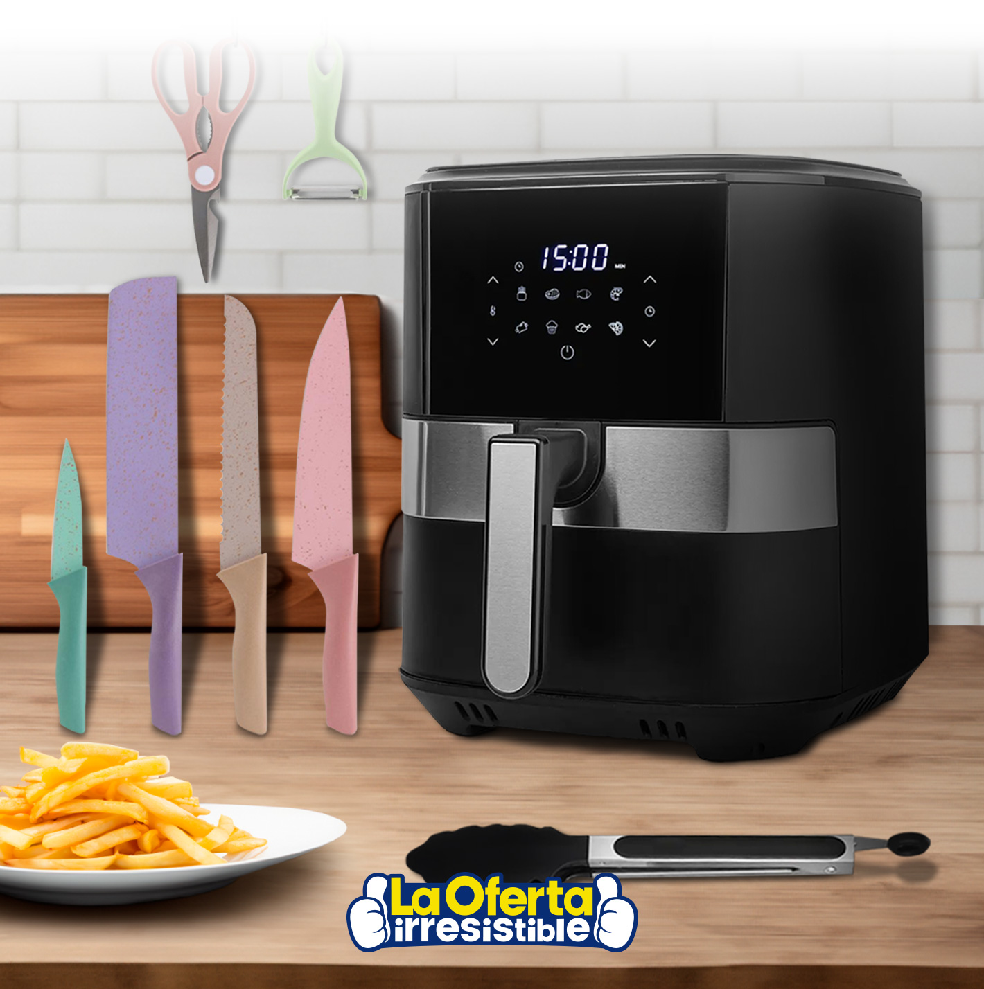 Freidora Sin Aceite GADNIC Digital 1000W 6.5 LITROS Control Táctil + Pinza + Set de Cocina 6 Piezas Fibra de Trigo