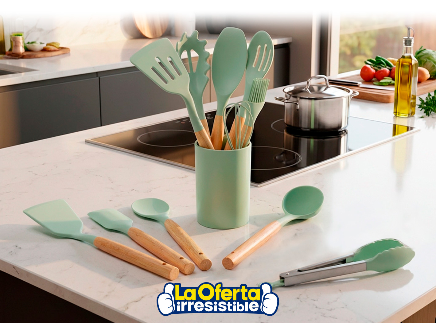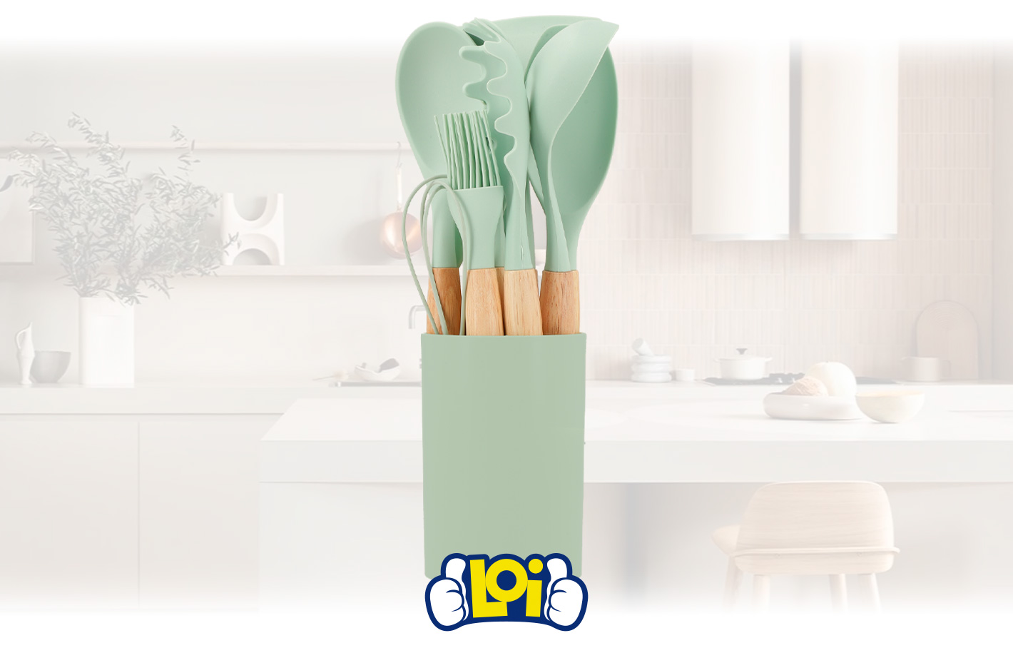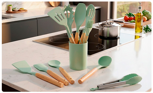 Juego de Menage en Silicona y Madera de 11 Piezas + Soporte - Beige