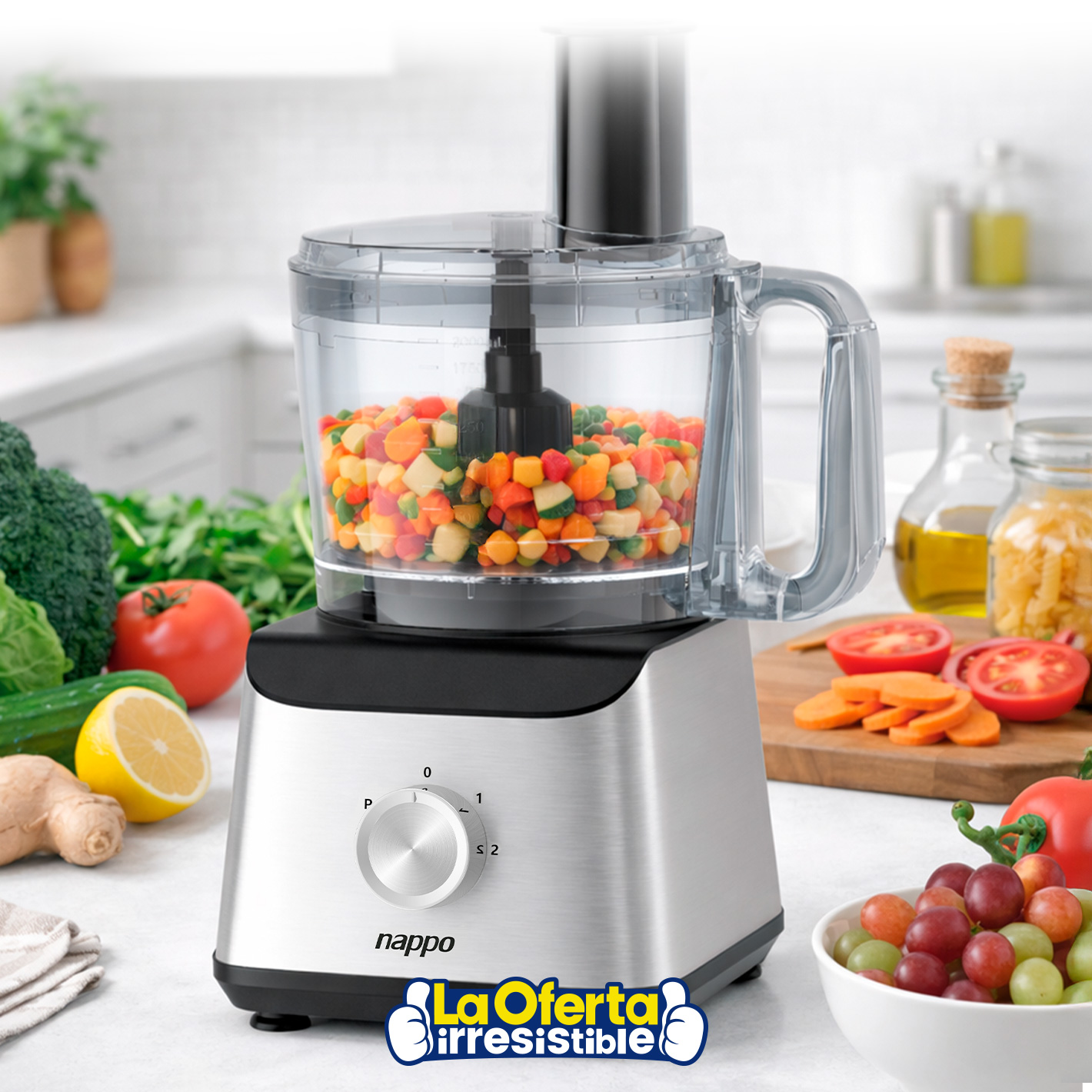 La Multiprocesadora NAPPO 12 en 1 es la aliada ideal para tu cocina, ya que permite procesar, cortar, picar, triturar, amasar, licuar y mucho más en un solo equipo. Cuenta con un potente motor de 1500W que alcanza hasta 20000RPM, dos velocidades más función pulso y cuchillas de acero inoxidable para resultados rápidos y precisos. Su cuerpo de acero inoxidable combina resistencia, durabilidad y un diseño moderno, ideal para simplificar cualquier preparación diaria.Podés canjear este artículo usando tus Metros OCA