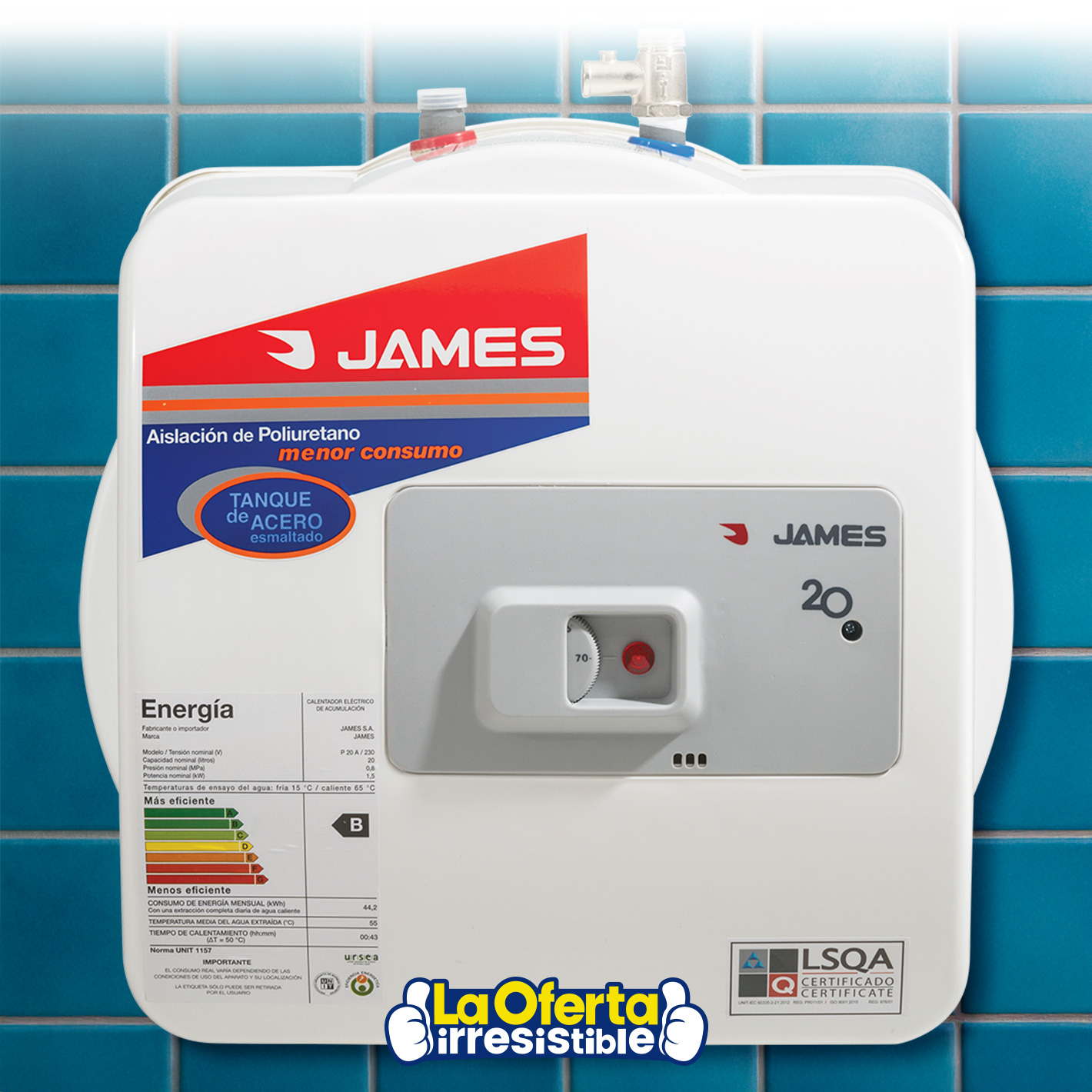 Termotanque JAMES Calefón 20L Prisma SALIDA SUPERIOR Tanque de Acero con Proceso Permaglass