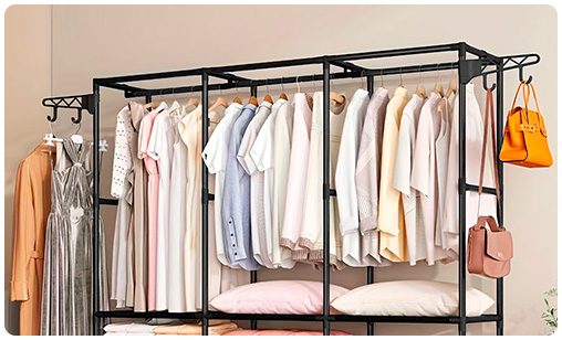 Este ropero de metal con perchero triple es ideal para mantener tu ropa siempre organizada y accesible. Ofrece gran resistencia y durabilidad, soportando hasta 14kg en el perchero principal y 11kg en los laterales, perfectos para prendas pesadas, zapatos o ropa de cama. Está fabricado con un marco de acero robusto y estantes de tela no tejida, lo que lo hace resistente a la humedad y sencillo de limpiar. Su diseño práctico y versátil se adapta a distintos ambientes del hogar, como dormitorios, salas de estar, estudios, oficinas o lavaderos.
