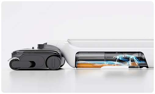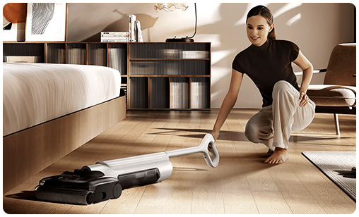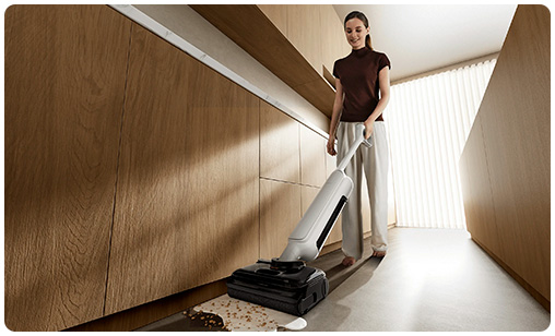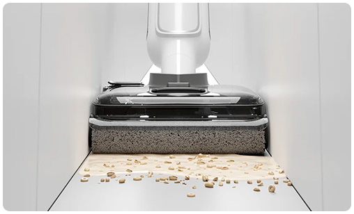 Con una combinación de aspirado, fregado y limpieza del cepillo de rodillo a la vez, cuenta con un sistema de agua limpia en tiempo real para eliminar el pelo, las partículas y las manchas difíciles de forma simultánea, lo que acaba con las molestias de la rutina tradicional de aspirado antes de fregar.