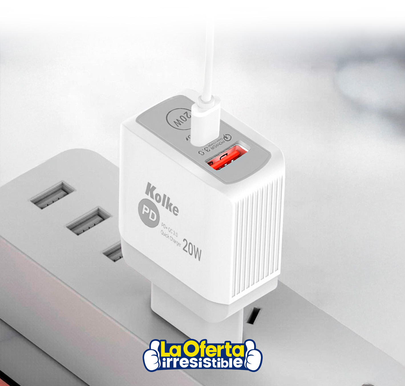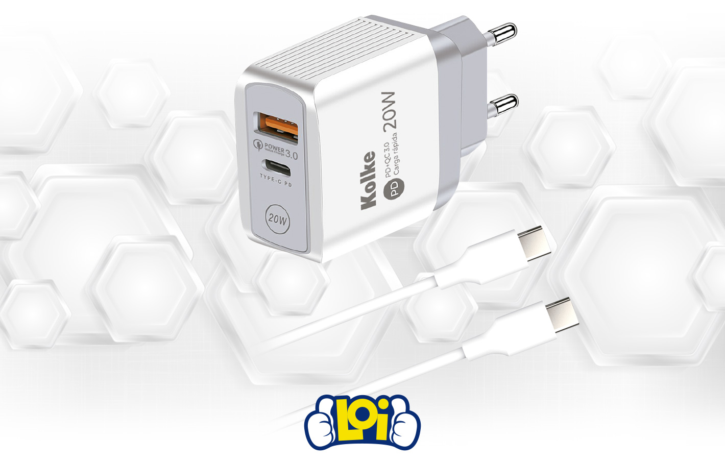 Cargador Rápido de Pared KOLKE con cable USB-C PD + QC 3.0 con 20W de potencia