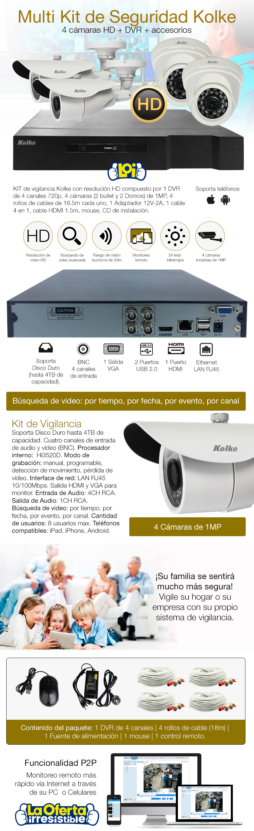 Kit de Seguridad KOLKE HD 720p DVR + 4 Cámaras 1MP + Accesorios