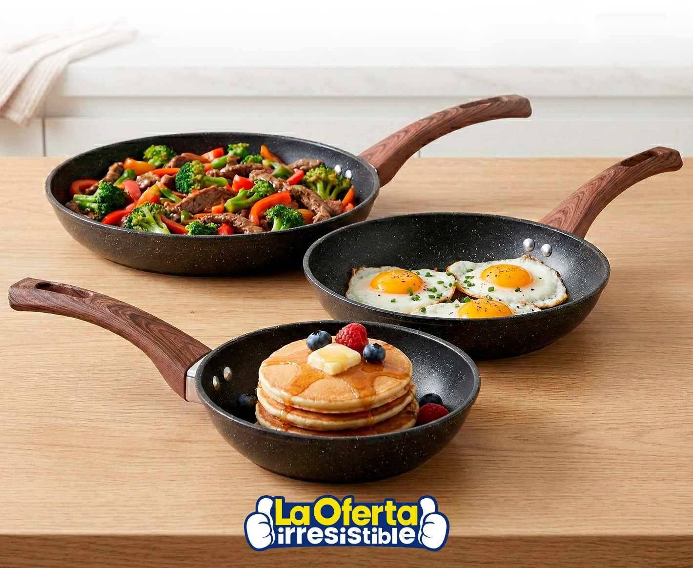Este práctico set de sartenes incluye tres piezas de 20, 24 y 28cm, ideales para adaptarse a distintas preparaciones en la cocina diaria. Cada sartén cuenta con mango ergonómico resistente al calor que brinda mayor comodidad y seguridad durante el uso, mientras que su revestimiento antiadherente facilita la cocción de todo tipo de alimentos, desde huevos y tortillas hasta carnes o salteados, evitando que los ingredientes se adhieran. Diseñadas para ofrecer calentamiento rápido y distribución uniforme del calor, son compatibles con cocinas convencionales y además aptas para lavavajillas, lo que simplifica su limpieza y mantenimiento.Podés canjear este artículo usando tus Metros OCA