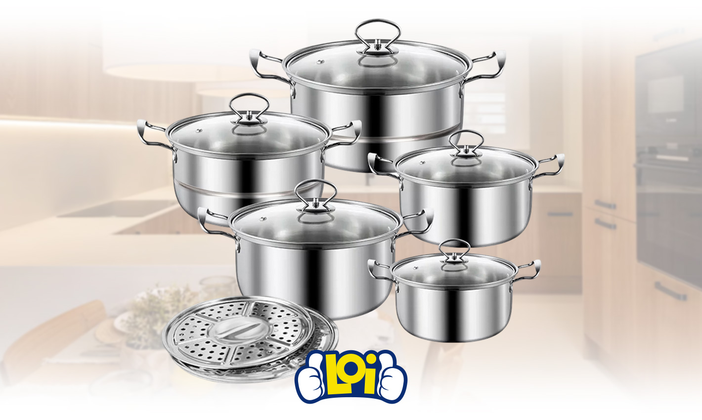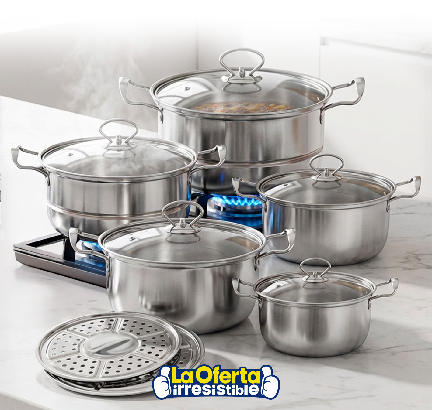 Batería de Cocina de 12 Piezas de Acero Inoxidable