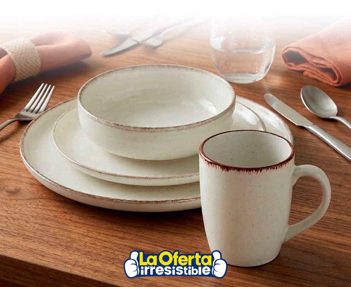 Renová la presentación de tu mesa con este set de vajilla de cerámica para 4 personas, diseñado para combinar elegancia y practicidad en cada comida. Fabricado en cerámica resistente de alta calidad, ofrece durabilidad para el uso cotidiano. Su acabado blanco brillante con pintas y bordes en tono marrón aporta un estilo moderno y sofisticado que realza cualquier preparación. Además, su diseño apilable permite guardarlo fácilmente optimizando el espacio, y es apto para microondas y lavavajillas, brindando mayor comodidad y practicidad en el día a día.Podés canjear este artículo usando tus Metros OCA