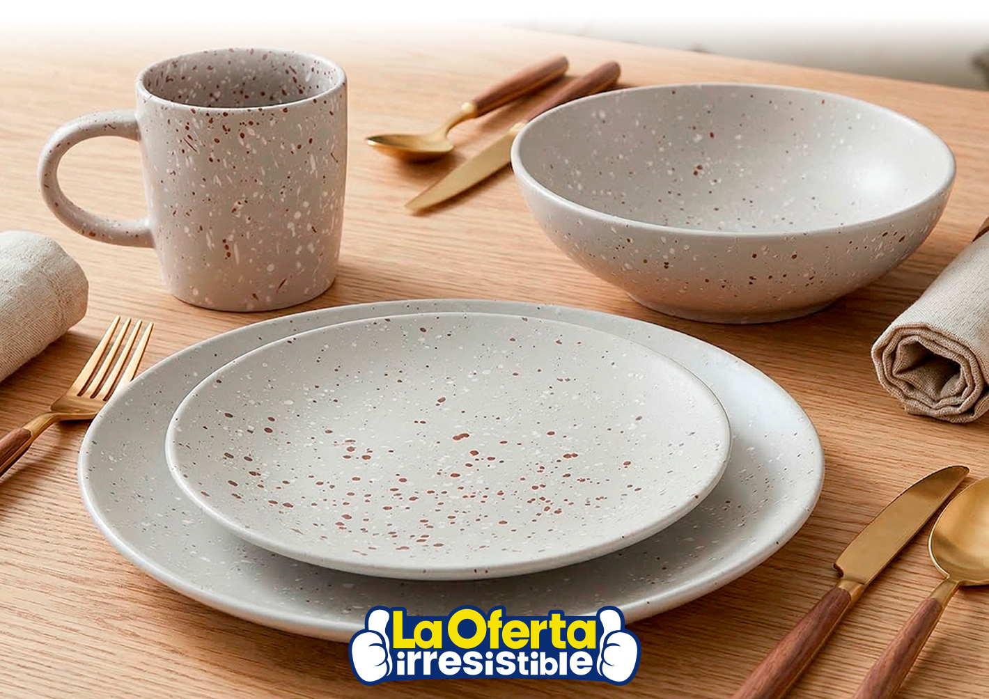 La vajilla de cerámica de 16 piezas para 4 personas combina estilo moderno y funcionalidad para vestir tu mesa con elegancia. Su diseño minimalista con pintas decorativas aporta un toque contemporáneo y distintivo que se adapta fácilmente a distintos estilos de cocina y comedor. Fabricada en cerámica de alta calidad, es resistente al uso diario y a las manchas, además de ser apta para microondas y lavavajillas, ofreciendo practicidad en cada comida. Ideal tanto para cenas familiares como para ocasiones especiales, este set permite presentar tus platos con una estética cuidada y moderna.Podés canjear este artículo usando tus Metros OCA