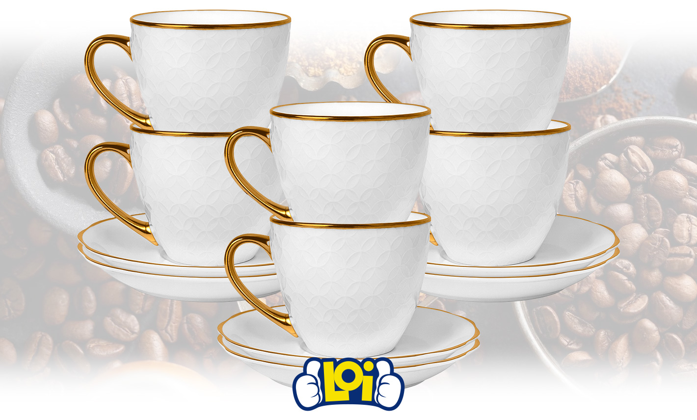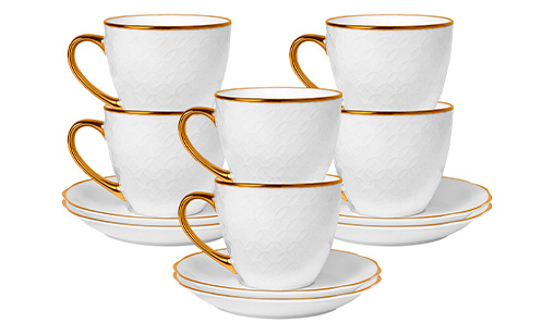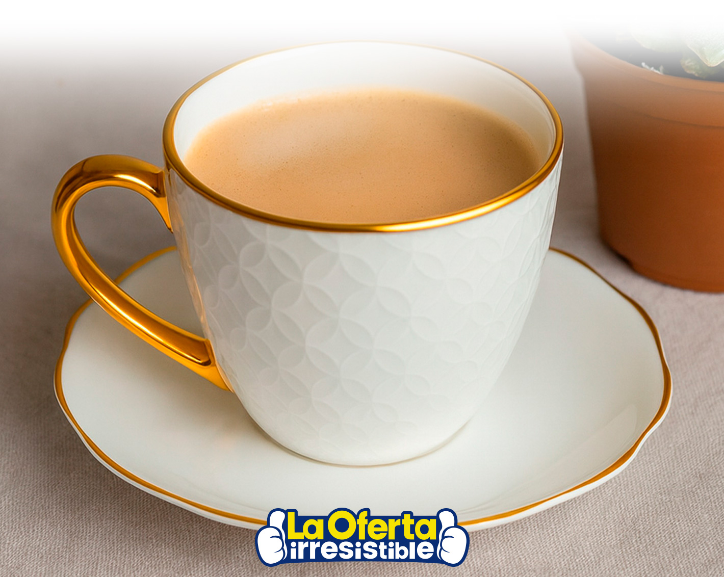 Juego de Tazas con Platos, 12 Piezas de Cerámica con Borde Dorado
